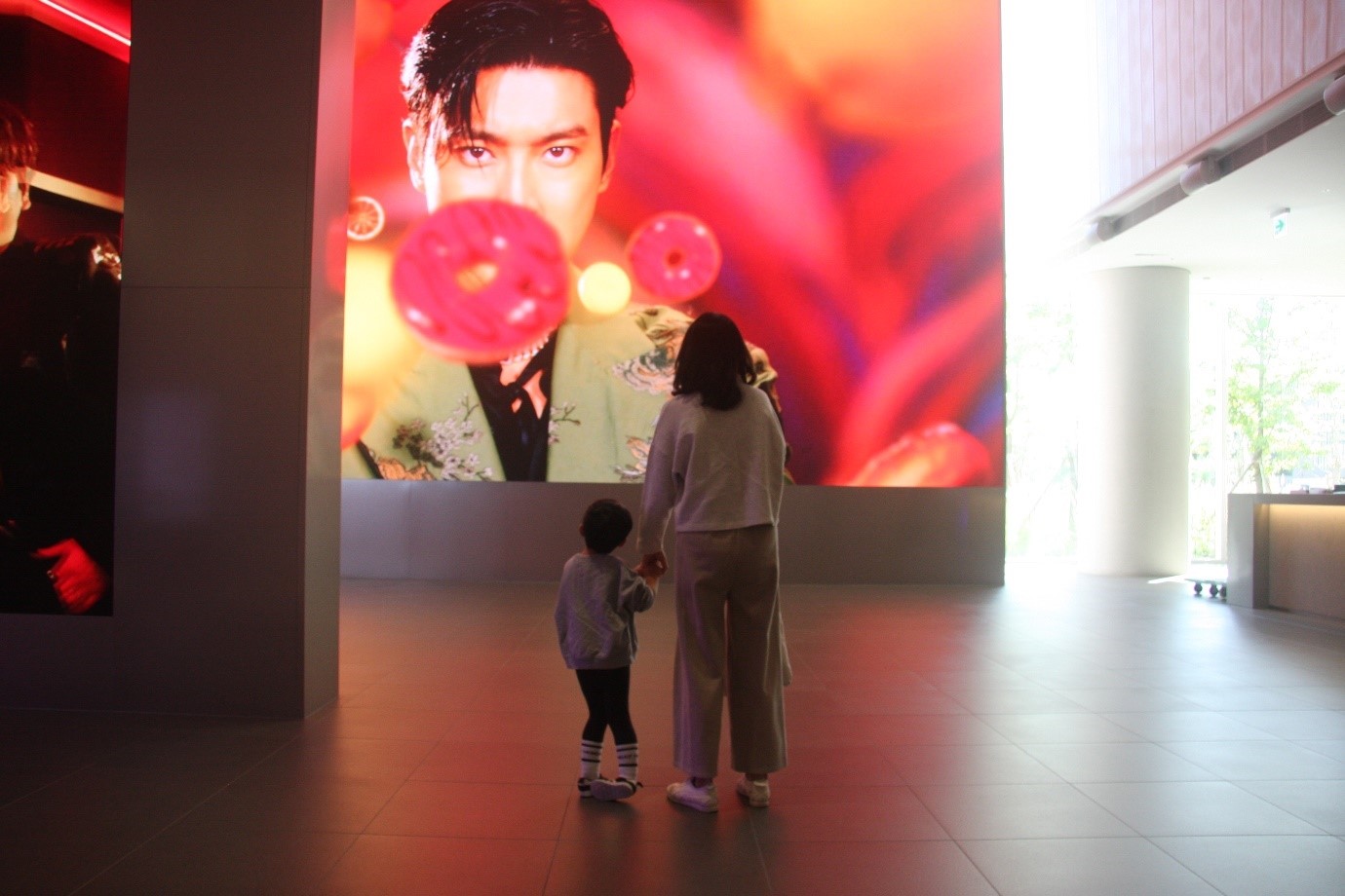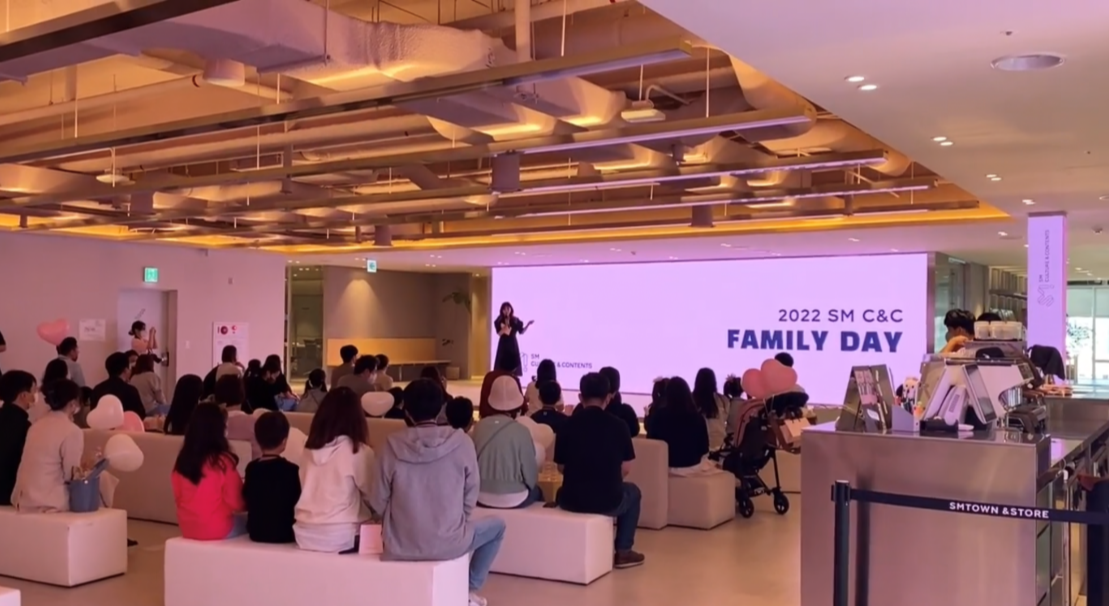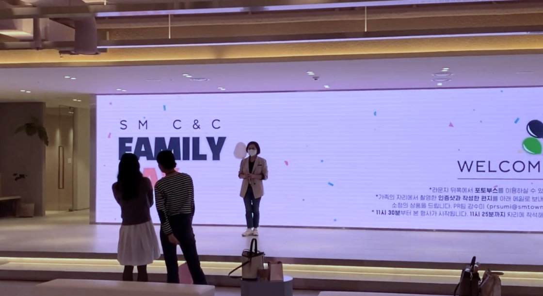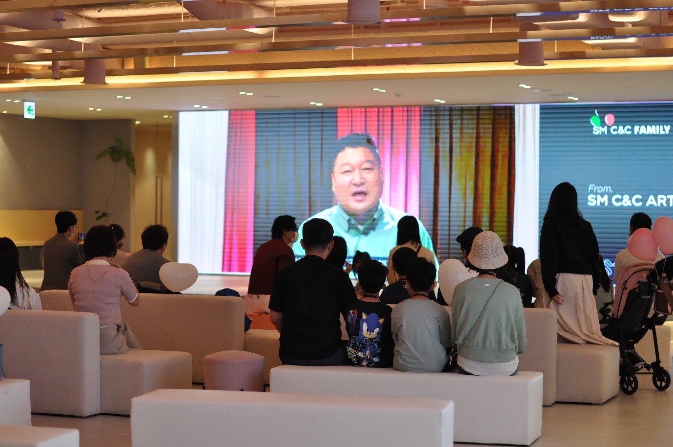 ▲사옥 1층 대형 스크린 화면에서 플레이 되는 뮤직비디오를 보고 있는 가족들. 출처=SM C&C