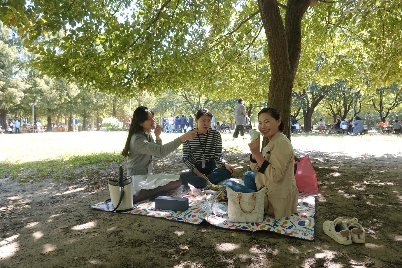 피크닉 하기 딱 좋은 가을날, 가족들이 서울숲 한 곳에 자리를 잡았습니다. 성수 사옥의 가장 큰 장점은 회사 인근에 서울을 대표하는 공원 ‘서울숲’이 있다는 건데요. 회사와 가까워도 평일에는 바쁜 업무로 돌아볼 시간이 없었던 서울숲에서 가족들과 함께 시간을 보냈습니다. 가을의 초입에 더욱 빛나는 이 곳에서 동료의 가족들과 인사도 하고 함께 둘러앉아 도시락을 나누며 식사를 즐겼는데요. 평소 업무 위주로 소통하던 동료와 우리 가족들이 함께 주말의 순간을 공유하는 경험은 또 다른 즐거움이었습니다.
