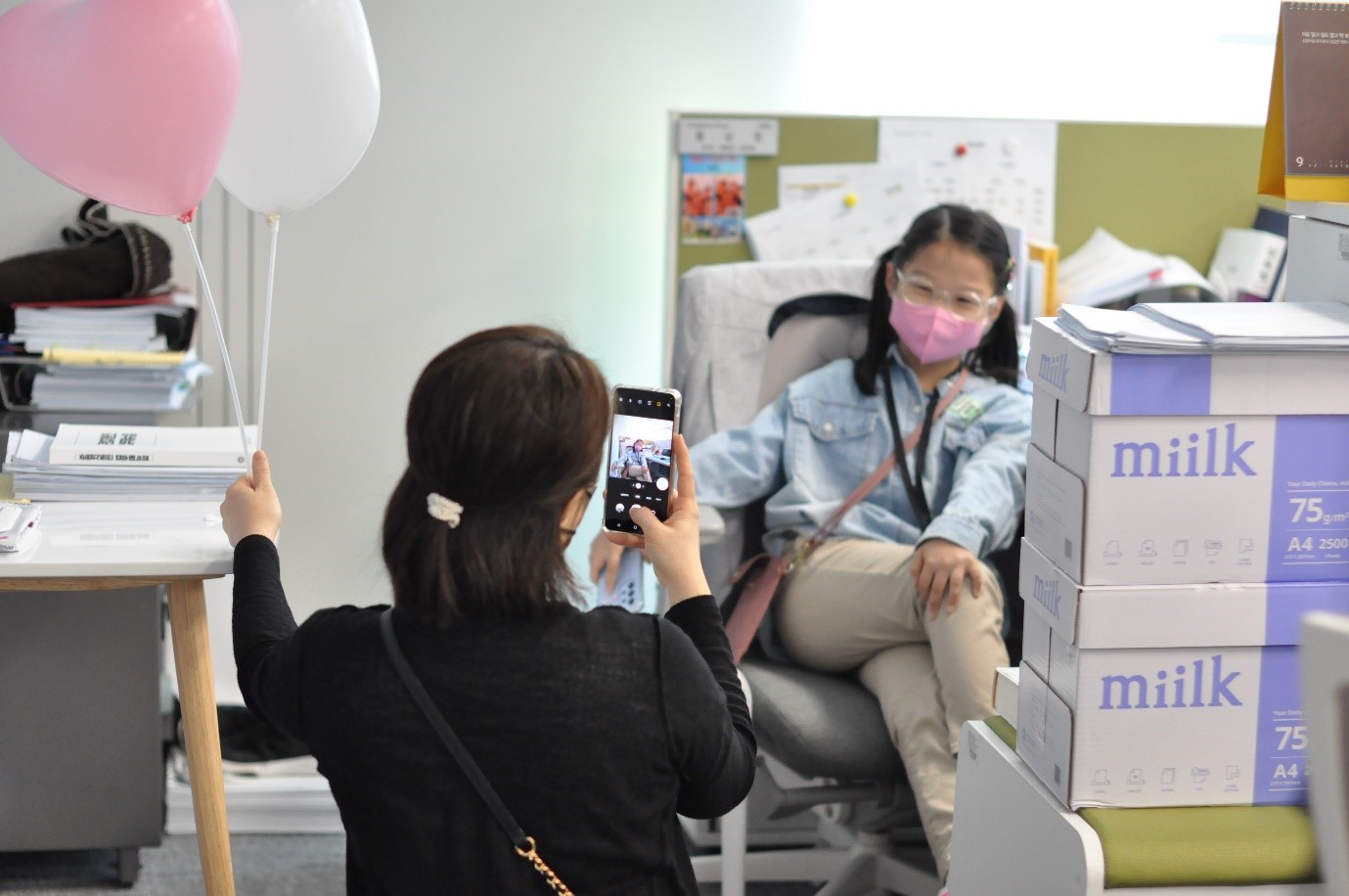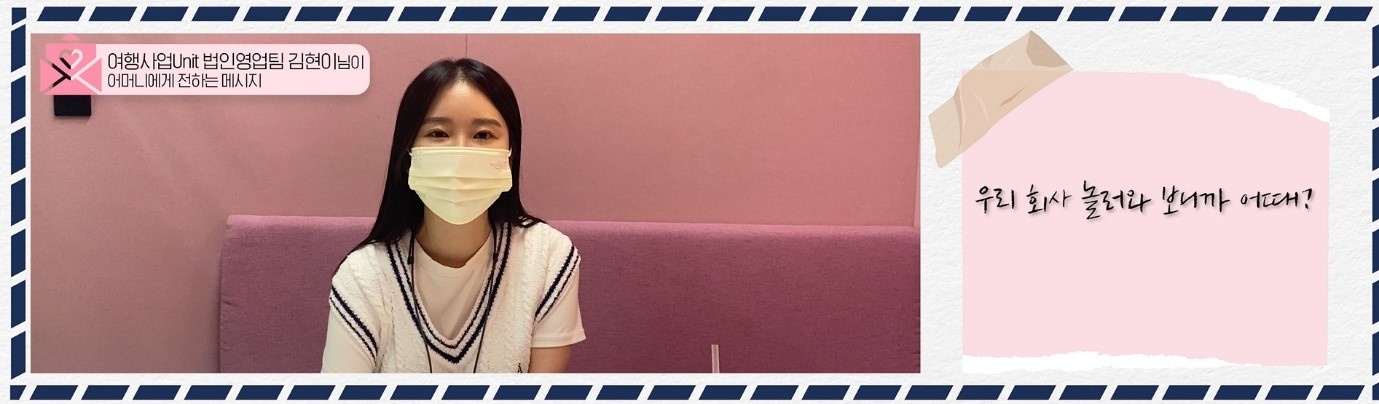 슬기야! 어리게만 여긴 슬기의 직장을 언니와 엄마가 함께 와 보니 엄마가 잘 키우고 잘 커 준 듯해 너무 감동이란다. 중학생 같은 외모에 이 큰 회사의 일원이 되어 성장하는 모습을 보니 엄마로서는 큰 보람을 느낀단다. 앞으로도 행복한 직장에서 성장하는 슬기가 되길 바랄게. 사랑하는 예쁜 딸! 파이팅! (엄마) 항상 어리게만 느꼈던 슬기야! 네가 일하는 곳에 와보니까 너무 대견하고 대단해보여! 멋진 어른으로 큰 것 같아 새삼 너무 뭉클하네. 항상 응원할게! 파이팅! (언니) |