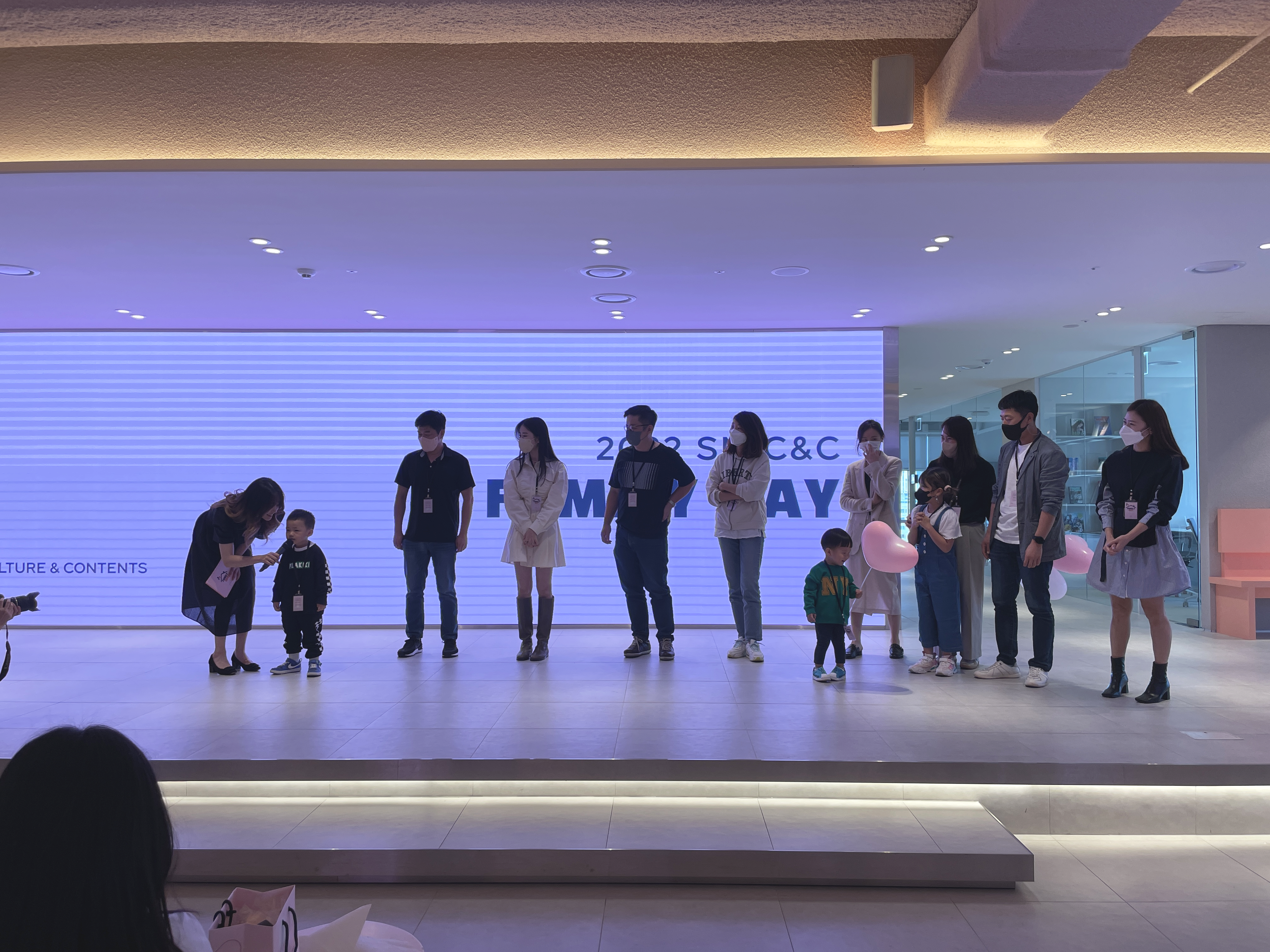 SM C&C에 대한 소개 영상 시사도 이어졌습니다. SM C&C는 광고, 스튜디오(STUDIO), 매니지먼트, 여행, 커머스 등 여러 사업Unit으로 이루어져 있는데요. 평소 우리 가족이 어떤 일을 하는지 막연하게는 알아도 막상 정확히 어떤 회사를 다니는지 설명하기 어려운 가족들의 궁금증을 풀어주는 시간이었습니다. 어린 자녀들도 엄마 아빠가 회사에서 무슨 일을 하는지 조금 더 관심을 갖고 이해할 수 있도록 준비된 시간이었죠.