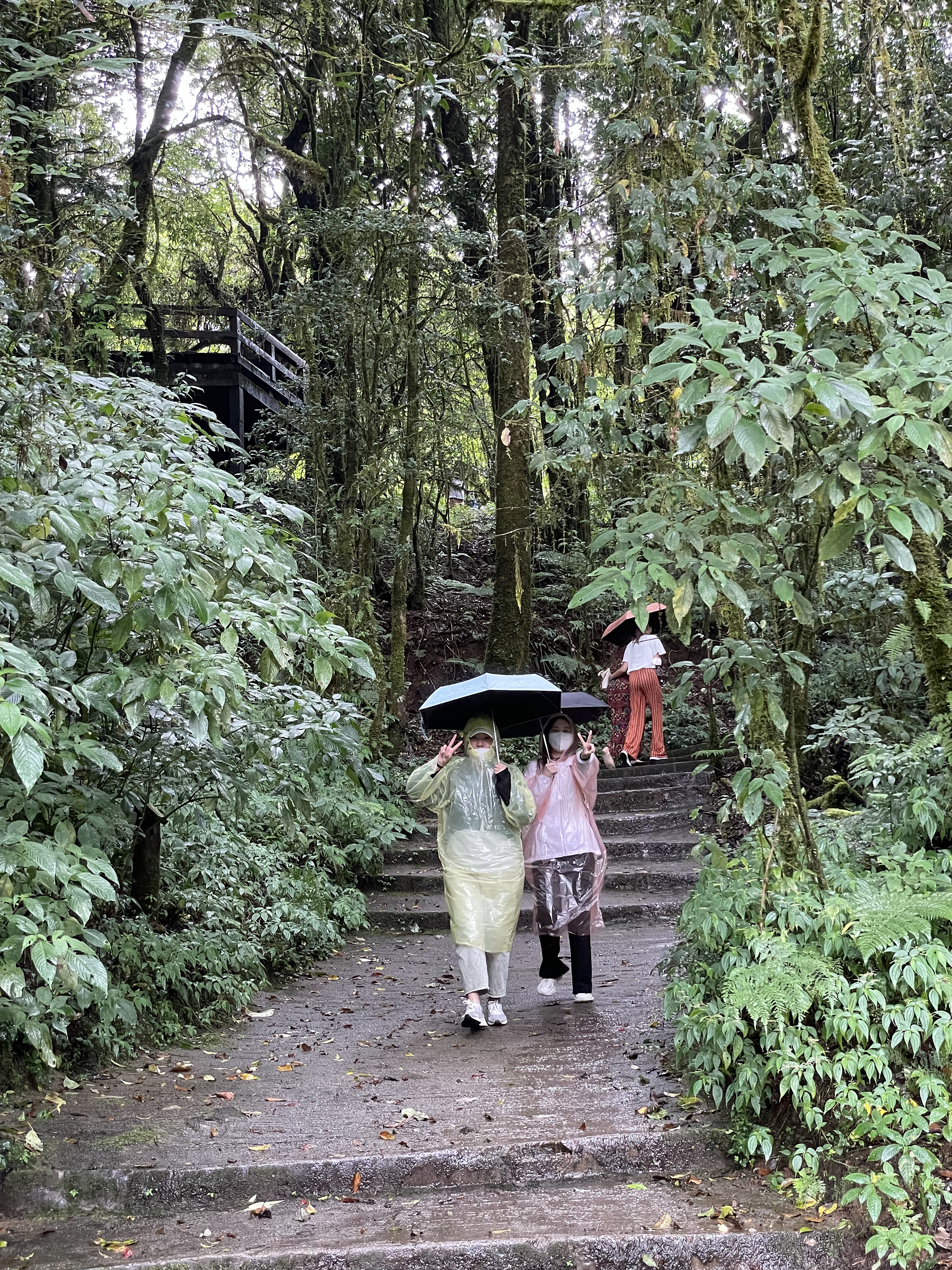 도이인타논의 산 정상 트래킹 중 비가 쏟아져서 급하게 우비를 꺼내 입은 생화님(왼쪽)과 채린님.