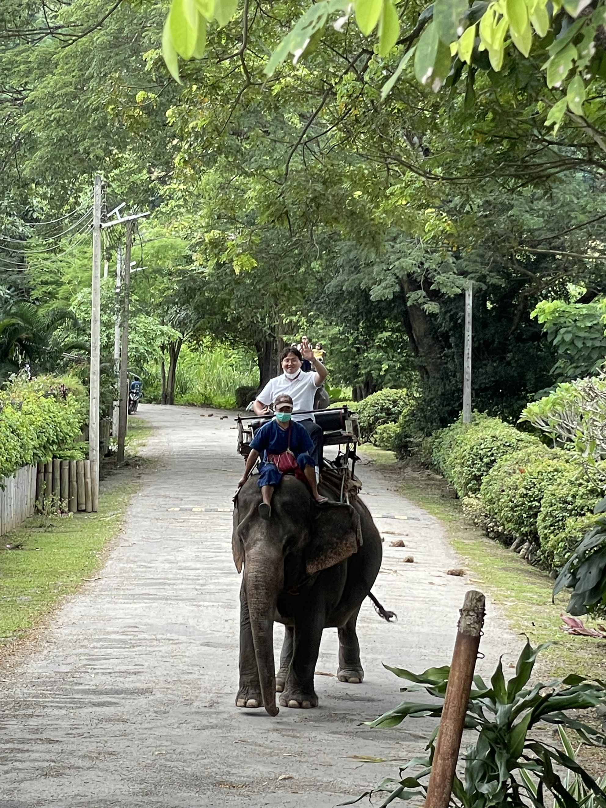 흔들리는 코끼리 위에서 안정감 있게 손을 흔들며 여유를 보이는 코끼리 왕자님 재근님의 모습.
