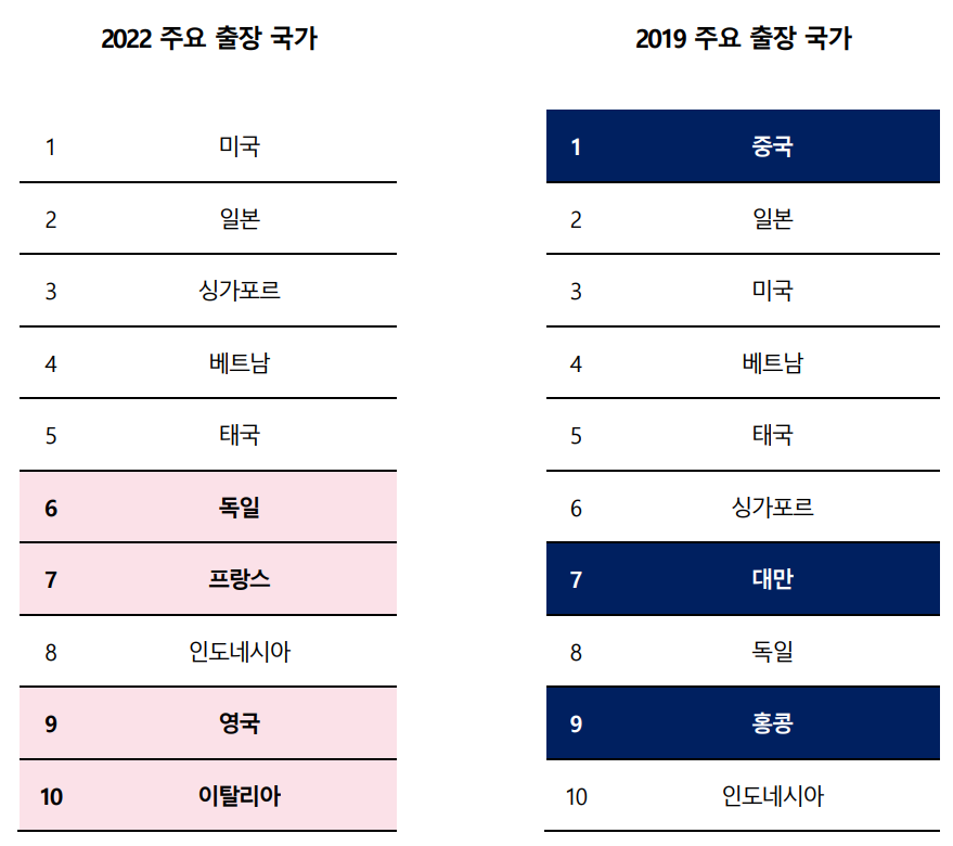 각국의 입국 제한 및 방역지침에 따라 출장지를 선택할 수 있는 범위가 제한되면서, 방역지침이 가장 먼저 완화된 유럽 국가를 목적지로 한 출장이 늘었습니다. 중국, 홍콩, 대만 등 다소 보수적인 코로나19 정책을 펴는 중화권 국가로 향하는 출장은 2019년 대비 크게 줄었습니다.