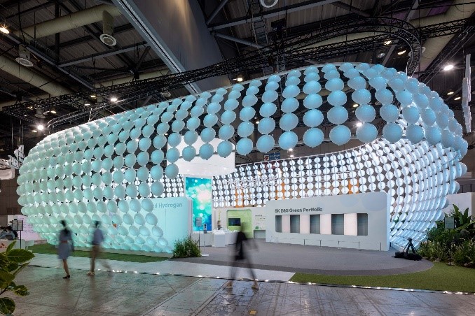 산업 전시는 가장 먼저 부스의 전체적인 룩Look, 디자인의 방점을 어디에 둘 지를 저희와 협력 벤더사, 광고주 모두 긴밀하게 협의하고 결정해서 플래닝하게 됩니다. 일단 ‘수소’라는 산업이 일반인들에게는 구체화되어 닿지 않는 개념으로서의 한계가 있잖아요. 5월에 앞서 참가했던 세계가스총회 때부터 SK E&S와 저희 팀에서는 새로운 볼거리, 새로운 룩을 찾아 개발하는 데 포커스를 두고 있었어요. 그때 수소 그대로를 아트 작품처럼 보여주면 어떨까라고 아이디어를 냈고, 수소 원자를 형상화한 반구 집합체를 ‘에너지셀Energy Cell’이라는 것으로 표현해 수소 원자가 모여 에너지가 된다는 메시지를 줄 수 있는 룩을 만들었어요. 에너지셀 하나하나에 LED가 모두 설치되어 색의 변화, 색의 무빙을 통해 에너지로의 전환이라는 메시지를 역동적으로 시각화해 전달하게 되는 거죠. 그 지점이 저희 이번 전시 기획의 모티브가 되었어요.