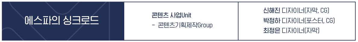 프로그램의 기획 의도를 잘 녹일 수 있어야 하고요. 타이틀에서 볼 수 있듯이 에스파만의 세계관과 스토리가 다른 프로그램 대비 가장 큰 특징이자 차별점이기 때문에 이를 컬러나 폰트, 그래픽 요소를 통해 직관적으로 전달하려 노력했습니다.