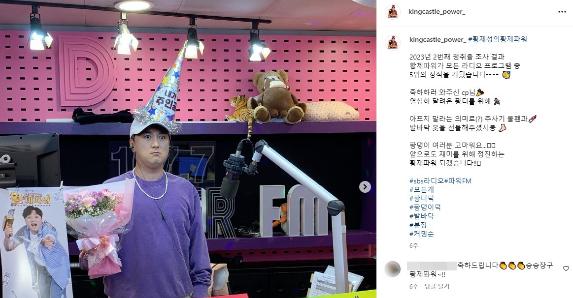 황제성은 남다른 순발력과 타의 추종을 불허하는 입담을 바탕으로 프로그램을 맡은 1년 만에 인기 라디오 DJ의 반열에 올랐습니다. 오디오 하나만으로도 사람을 웃음 짓게 만드는 능력자인 덕분에 23년도 1라운드 라디오 청취율 조사 결과 프로그램 청취율 순위 TOP10에 등극하고, 2라운드 조사 결과 5위의 성적을 거두는 쾌거를 이뤄내, ‘황제성의 황제파워’ 라디오 공식 인스타그램(@kingcastle_power_)을 통해 청취자들과 그 기쁨을 함께 나누기도 했습니다.