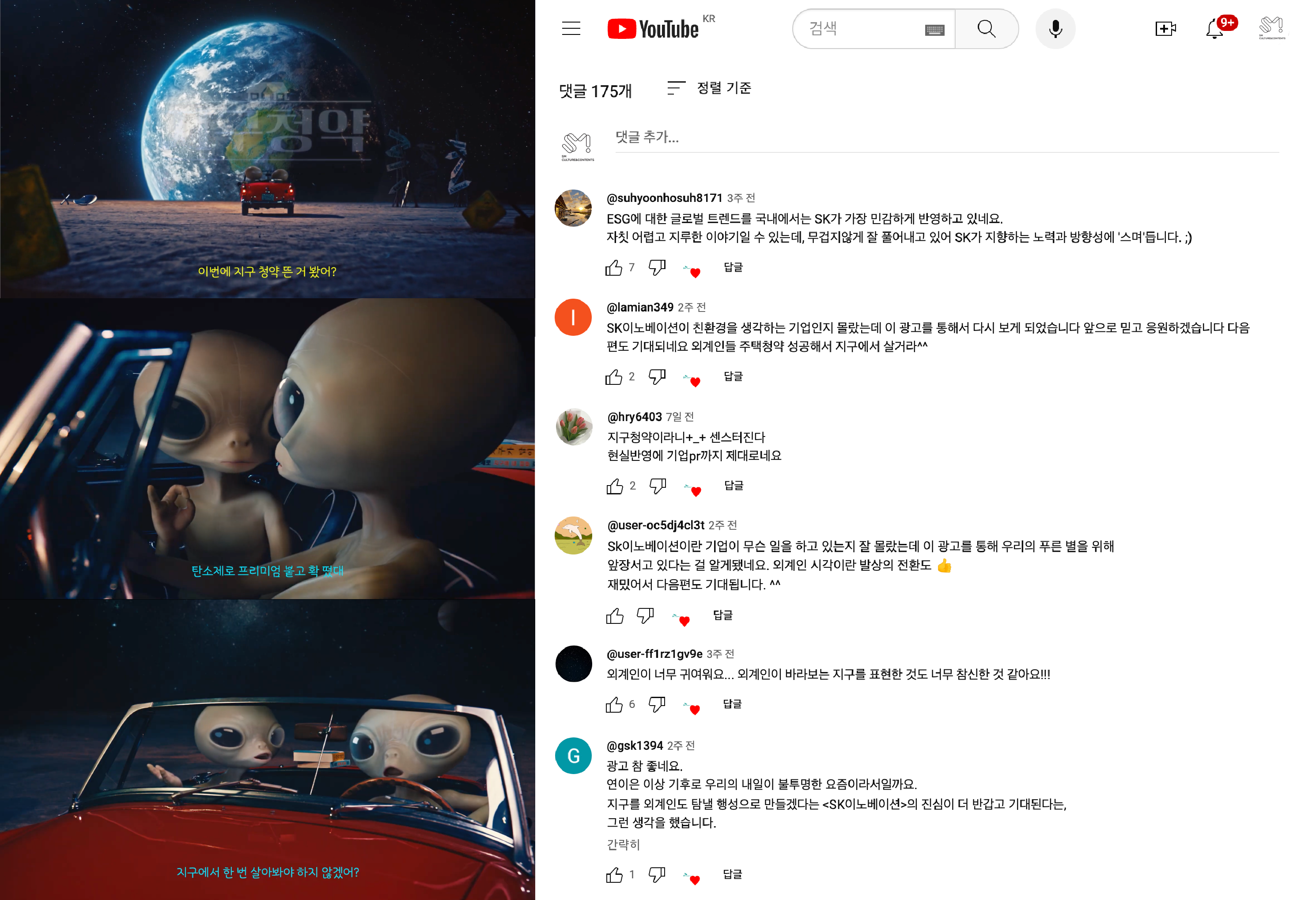 모두의 노력 끝에 만들어진 광고 캠페인은 업로드 당일 기준만으로도 댓글 200개, 조회수 100만 뷰를 가뿐히 넘어섰습니다. 뿐만 아니라 SK이노베이션 유튜브 채널의 구독자 수도 1주일 만에 약 2만 명 가까이 증가하는 등 성과를 달성해 광고주분들과 기획, 제작, 촬영에 참여한 모두의 고생이 빛을 발했습니다.