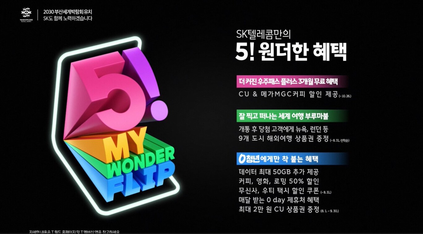 SK텔레콤의 놀라운 혜택에 대한 감탄과 5번째 Flip 시리즈라는 의미를 담은 ‘5! my wonderFlip’을 슬로건으로 활용하고, 지난 Z Flip4 캠페인 슬로건이었던 ‘What a wonderFlip’과의 연속성을 유도했다. 더불어 ‘wonderFlip’을 구매하면 ‘원더한’ 능력이 생긴다는 스토리로 고객들의 기대감을 유도했다.