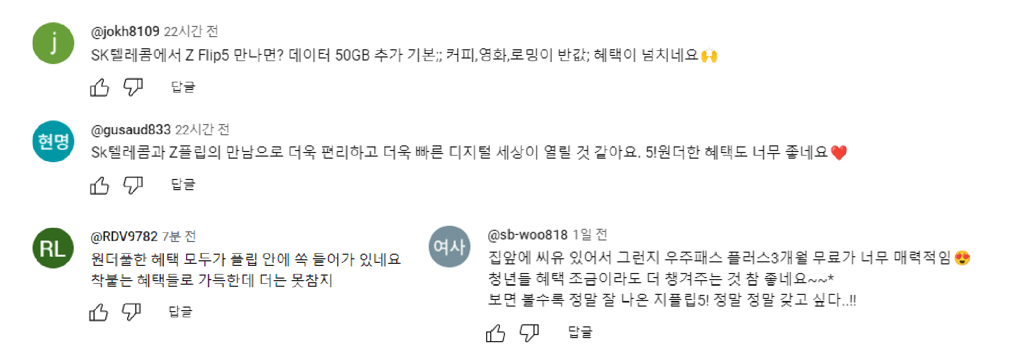 캠페인의 공개 이후 기사 등 자료에 따르면, 정량적으로 사상 최초로 100만대를 넘는 판매량의 기록을 쓰고 있고, 사전 예약 고객 중 62%가 20~30대 청년 고객에 달할 정도로 젊은 세대들이 SK텔레콤을 통해 Z Flip5를 선택한 것으로 나타났습니다. 이중 2030 여성들의 압도적인 선호를 받는 결과까지, SK텔레콤의 캠페인 영상에 대한 긍정적인 반응들도 지금까지 유튜브 등 다양한 SNS의 댓글 반응과 소비자 반응에서 긍정적인 수치로 증명되고 있습니다.