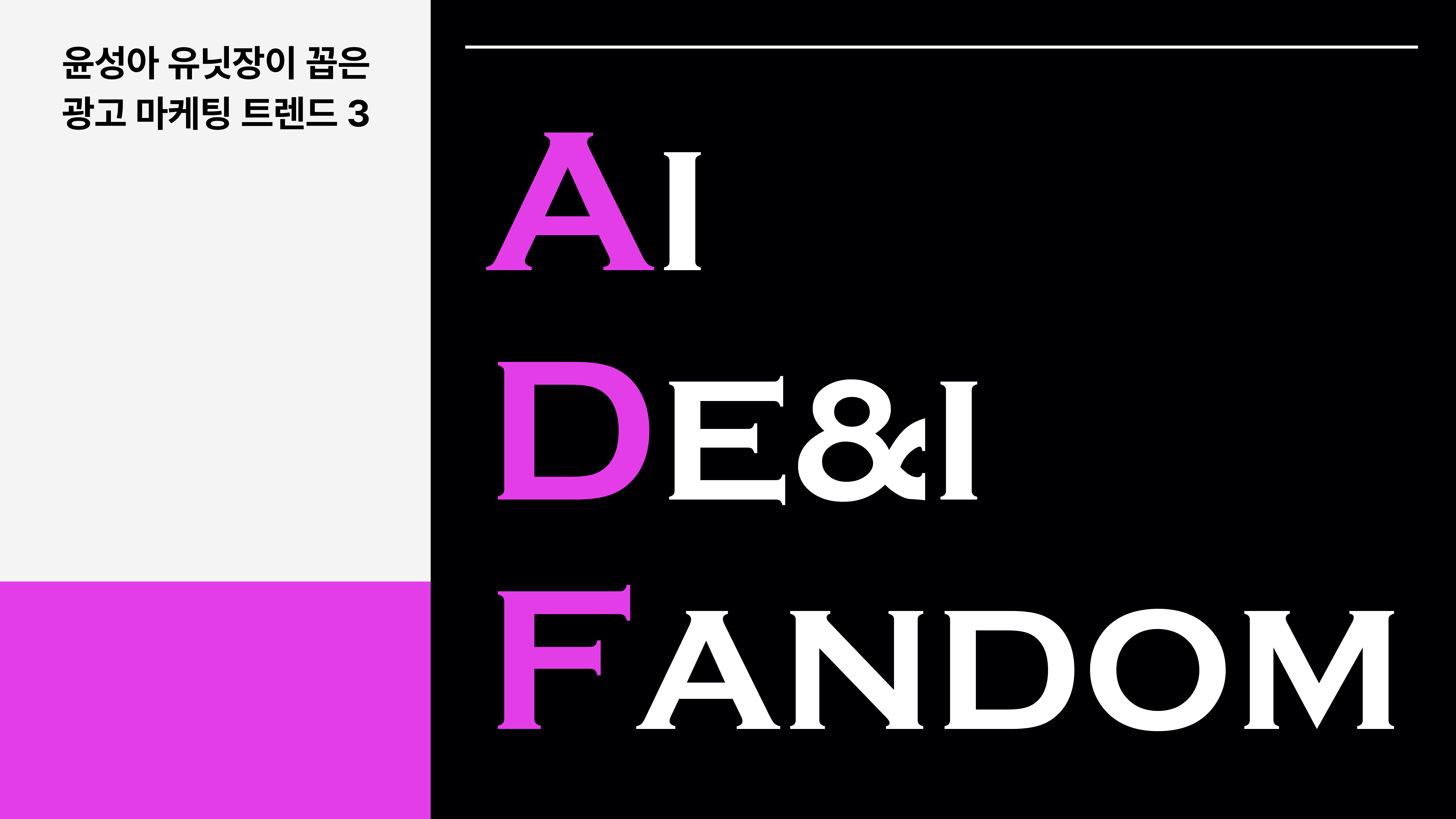 윤성아 유닛장은 AI 에 이어 주목해야 할 광고 마케팅 트렌드로 DE&I와 FANDOM을 꼽았습니다. 우선 DE&I는 최근 구글 트렌드에서도 급격하게 떠오르고 있는 키워드이자, 칸 라이언즈에서도 중요하게 다루어지고 있는 개념입니다. Diversity(다양성), Equity(형평성), Inclusion(포용성)을 결합한 것으로, 특정 종교, 민족성, 언어, 성적 지향, 장애 등을 모두 존중하는 평등한 문화를 의미합니다.