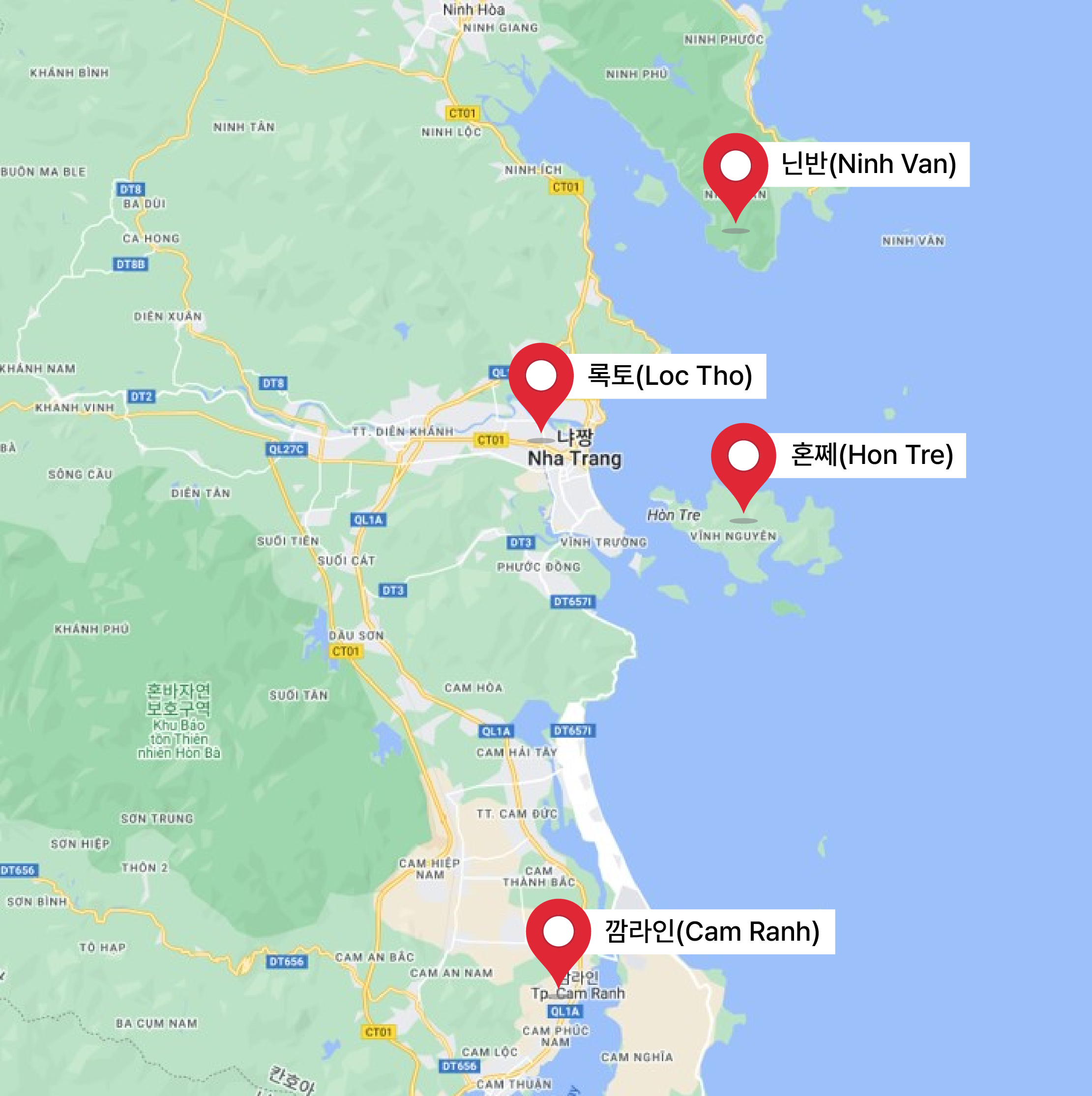 숙소를 결정하기 전, 기억해야 할 냐짱 지역 및 특징에 대한 공부는 필수! 냐짱은 크게 ▲록토(Loc Tho) ▲깜라인(Cam Ranh) ▲혼쩨(Hon Tre) ▲닌반(Ninh Van) 등 지역으로 구분할 수 있습니다. 지역 간 거리가 먼 것은 아니지만, 지역마다 분위기나 즐길 거리가 다르기 때문에 숙소 결정 시 참고하면 좋습니다.