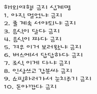 한편, 2023년에 여행과 관련해 화제가 되었던 커뮤니티 글이 하나 있습니다. 바로 가족과 함께하는 자유여행의 고달픔에 많은 사람들이 공감했던 ‘부모님 해외여행 금지 십계명’ 입니다.