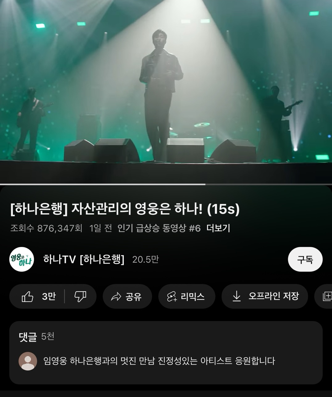 언제나 팬들이 환호를 부르는 포토카드, 하나은행 전국 600개 지점에 뿌려진 임영웅의 포스터, 그리고 등신대까지 - 임영웅과 함께하는 IMC 마케팅에는 필수재라는 사실, 의심할 여지가 없습니다. 결과 역시 캠페인 온에어 후 열흘이 조금 넘은 이 시점에 이미 전방위적으로, 그리고 전국적으로 나타나고 있습니다. 전국에 포진된 영웅시대 팬들이 속속 하나은행 지점들을 방문해 방문 인증 게시글이 실시간으로 올리고 있는 것은 물론, 티징 캠페인 소재와 본편 온에어 소재들 모두 유튜브 내 #실시간_인기_급상승_동영상에도 올라가 있습니다. 팬들의 열렬한 환호와 지지를 온몸으로 느낄 수가 있었죠.