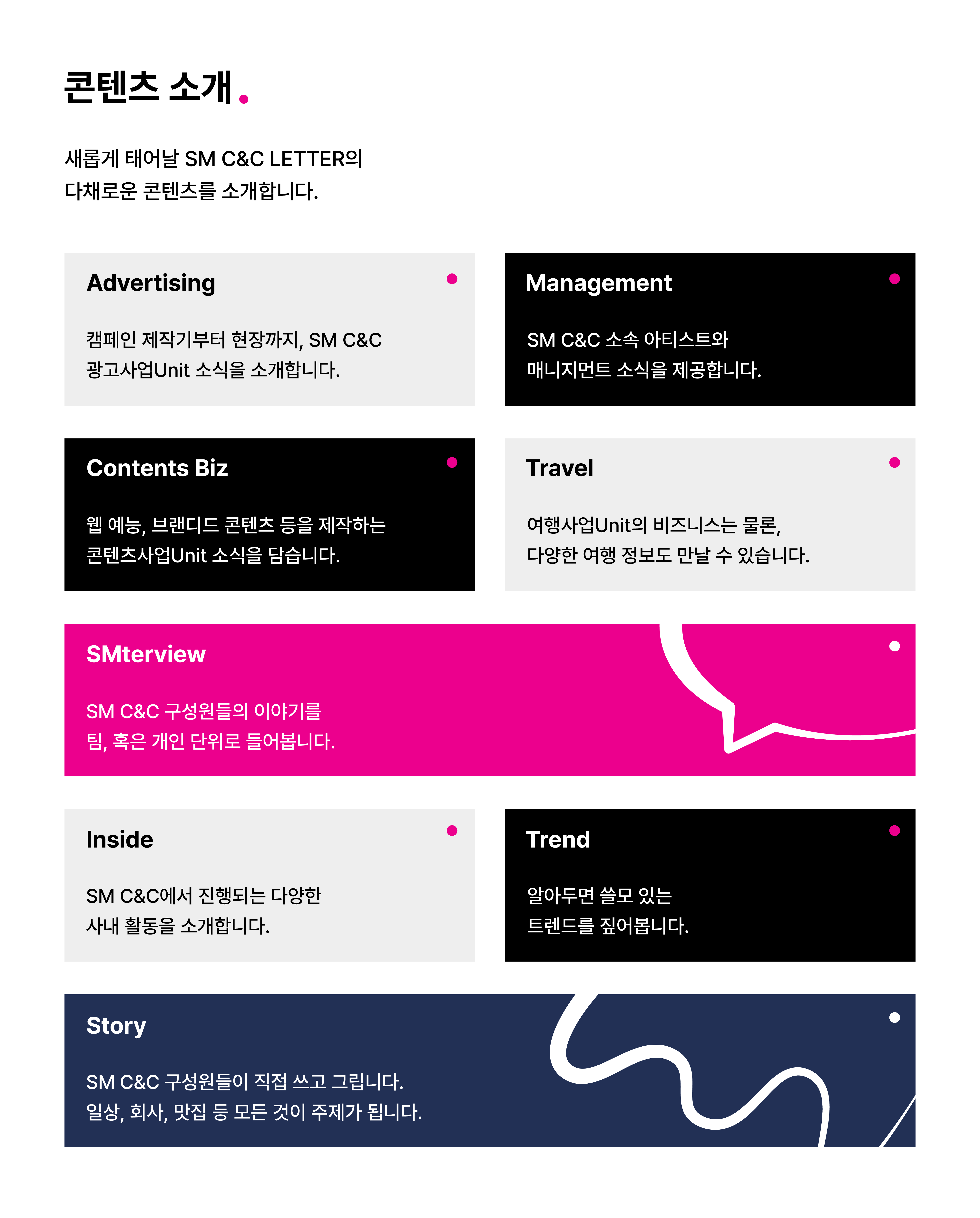 <Advertising>, <Management>, <Contents Biz>, <Travel> 등 사업Unit에서 제공하는 콘텐츠 외에도, <Insight>, <Trend> 등을 신설해 다양하고 유익한 정보를 제공합니다. 또 최근 첫선을 보인 <SMterview>도 적극적으로 활용합니다. SM C&C 구성원 대상의 인터뷰 콘텐츠로, 다양한 직업군에 대한 정보부터 K-직장인의 일상 등 공감이 가는 이야기까지 다채롭게 다룰 예정입니다.