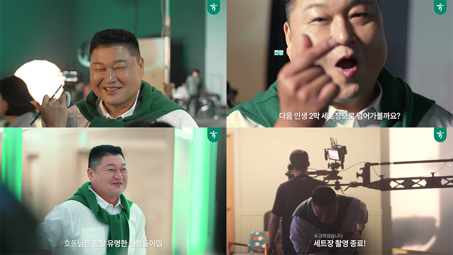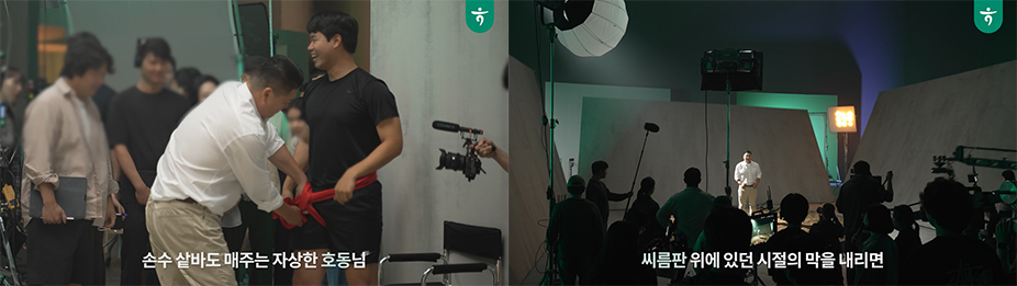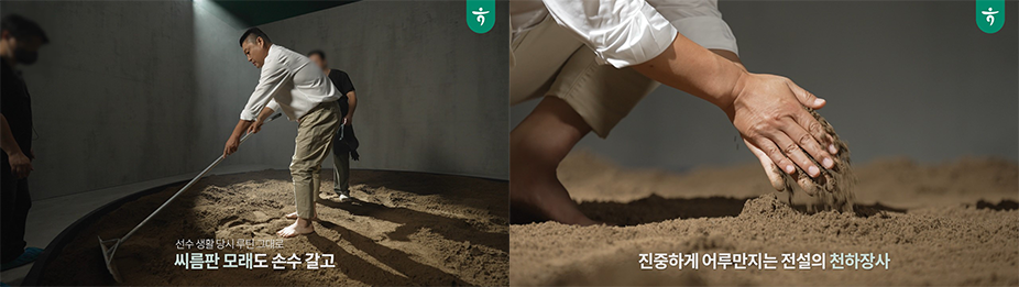 이번 캠페인 제작 현장에는 씨름판이 설치됐습니다. 강호동의 천하장사 시절을 생생하게 담아내기 위함이었죠. 강호동은 맨발로 씨름판에 올라 현직 선수처럼 진지한 태도로 연기에 임했습니다. 현장에는 씨름선수 역할의 엑스트라 배우가 있었는데요. 그가 샅바 매는 것을 어려워하자, 강호동이 직접 다가가 샅바를 매주며 현장을 훈훈하게 만들었습니다. 이후 시작된 촬영에서는, 강호동이 특유의 유쾌함으로 활기찬 분위기를 이끌어갔습니다. 마지막까지 웃음이 끊이지 않으며 성공적으로 촬영을 마무리할 수 있었습니다.