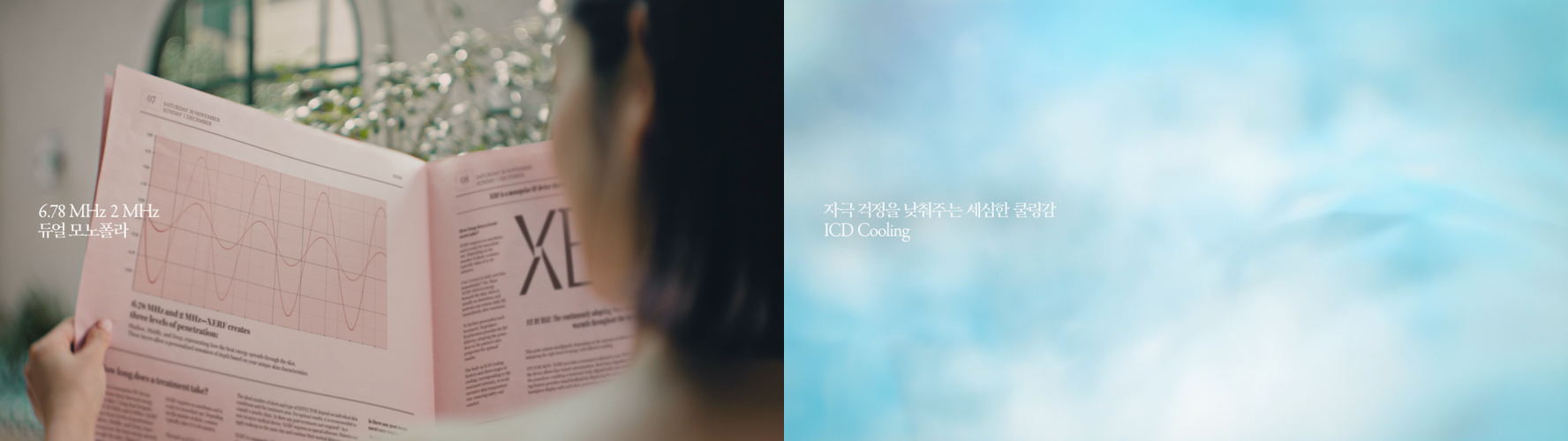 여기서 ‘고주파, 깊이 생각한다면’은 신중하게 알아보면 알게 될 거라는 의미 외에 또 다른 의미를 담고 있습니다. 제품의 USP인 서로 다른 두 개의 주파수로 가능해진 ‘깊이’의 변주(듀얼 모노폴라; 6.78MHz & 2MHz, Shallow-Middle-Deep)를 연상시키는 표현이기도 합니다. ‘섬세한 시술과 즉각적 효과’를 기대할 수 있게 하는 세르프만의 기술적 차별성을 담고자 한 표현입니다. 여기에 박신혜의 테이블 위에 놓인 촛불과 얼음의 대비를 통해, ‘ICD 쿨링 기술로 열에너지로 인한 통증까지 잡은 고주파 시술’임을 감각적으로 전달하고자 했습니다.