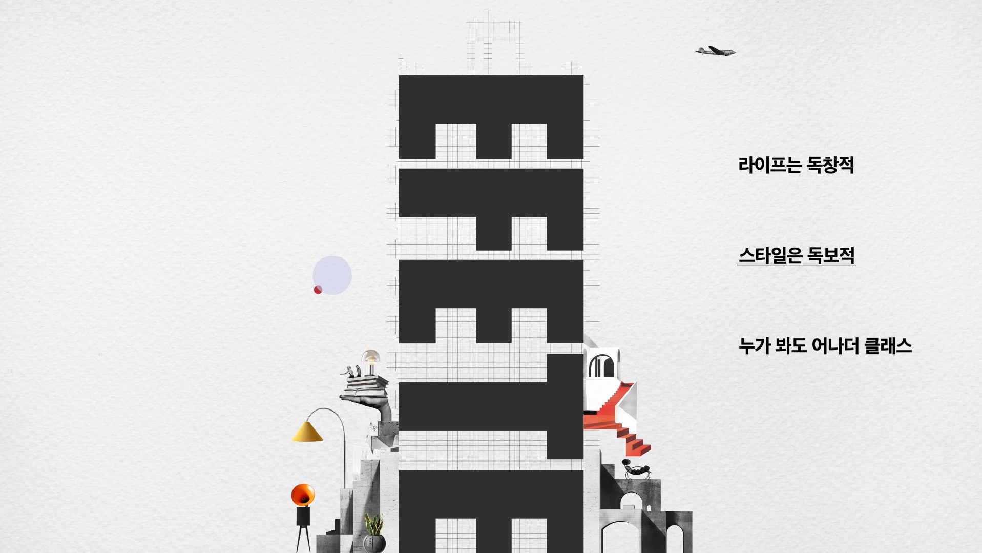 타깃 소비자들을 분석하는 일련의 과정들을 거치며 확고해진 점은 자신만의 라이프스타일이 확고한 사람이라면 정해진 틀에 맞춰 사는 아파트보다는 자신만의 방식으로 취향을 펼칠 수 있는 집이 따로 있을 것 같다는 생각이었습니다.
