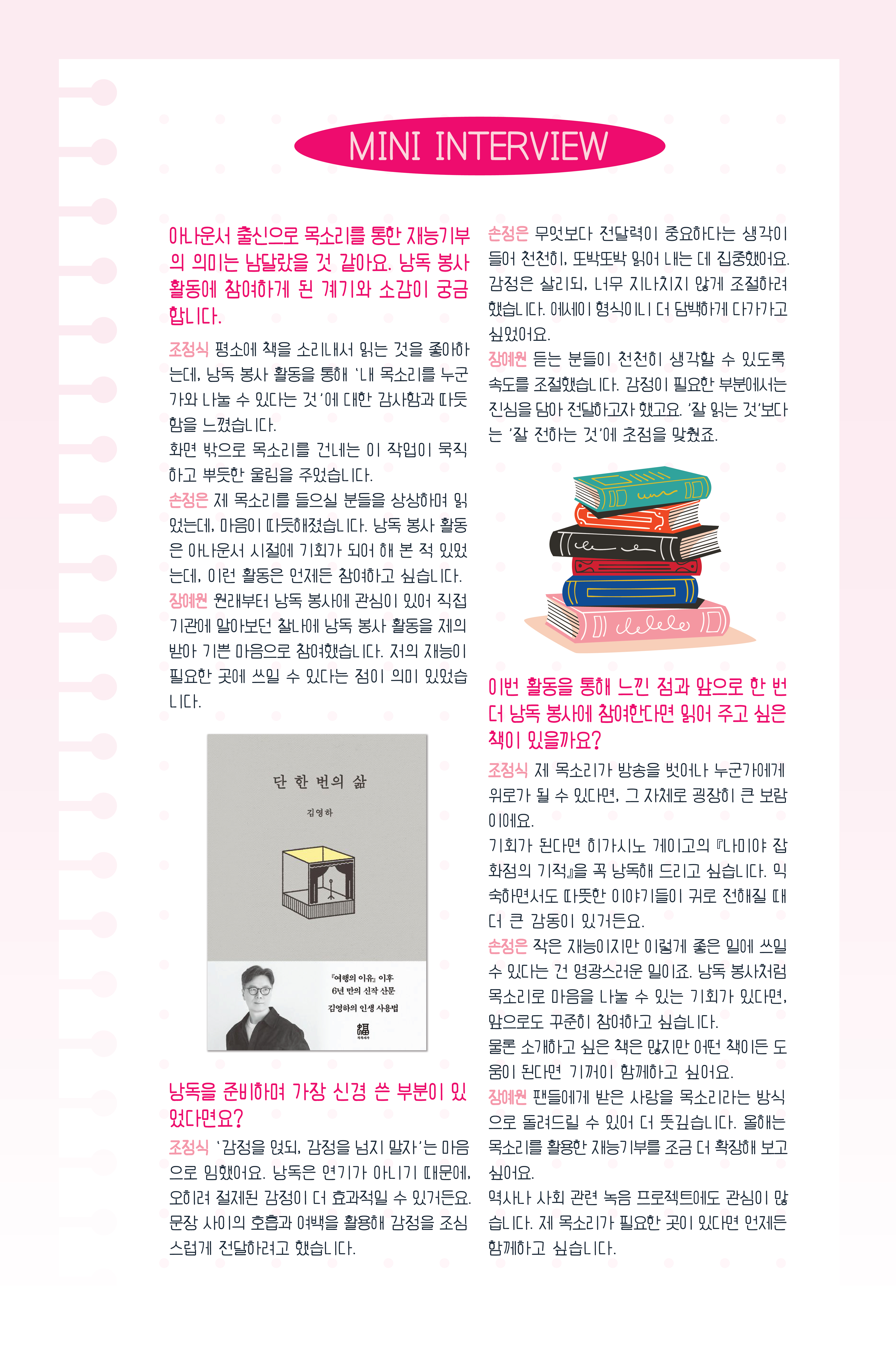 손정은, 장예원, 조정식은 한국점자도서관과 함께하는 시각장애인을 위한 책 낭독 봉사에 참여해 김영하 작가의 ‘단 한 번의 삶’을 낭독했습니다 ‘단 한 번의 삶’은 삶과 죽음, 존재의 의미를 깊이 있게 성찰해 ‘한 번뿐인 인생을 어떻게 살아갈 것인가’라는 묵직한 질문을 던지는 에세이로, 아티스트들의 목소리를 통해 책 속 메시지를 보다 감동적으로 전달했습니다.