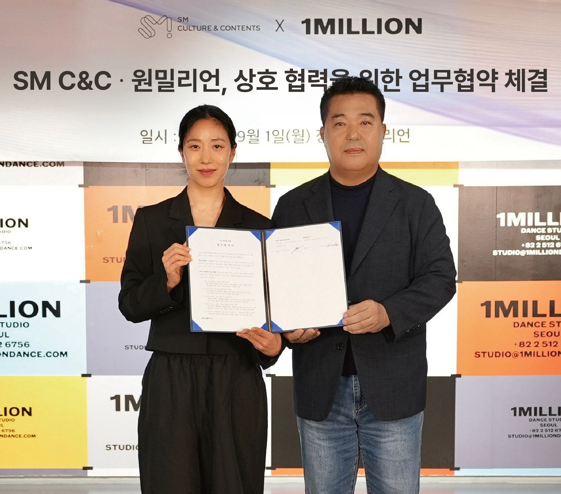 ㈜에스엠컬처앤콘텐츠(대표 박태현, 이하 SM C&C)와 ㈜원밀리언(대표 리아킴(김혜랑)은 9월 1일 전략적 업무협약(MOU)을 체결하고, 글로벌 시장을 겨냥한 공동사업을 본격적으로 추진한다고 밝혔다. 양사는 이번 협약을 통해 K-콘텐츠와 팬덤 기반 비즈니스에서의 시너지를 극대화하고, 다양한 협업 모델 공동 개발을 추진한다.