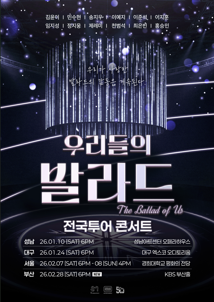 가장 먼저, 오는 2026년 1월부터 '우리들의 발라드 콘서트'를 통해 전국 각지 팬들과 만납니다. 2026년 1월 10일 성남을 시작으로, 1월 24일 대구, 2월 7일과 8일 양일간 서울, 2월 28일 부산, 3월 7일 대전까지 5개 도시를 순회합니다. 무한한 잠재력과 재능을 두루 갖춘 SM C&C 차세대 아티스트들이 음악과 공연, 그리고 여러 분야를 넘나들며 펼쳐 낼 활약에 많은 관심과 응원을 부탁드립니다.