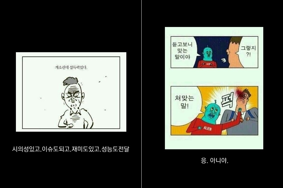 특이한 것이 아닌 논리적으로 타당한 다른 생각을 가져가는 게 중요한 작업인 것 같습니다. 관점을 보여줄 수 있는 카피를 써야 되는데, 카피는 글이 많아요. 글은 생각을 전달하는 수단 중에 하나인 거예요. 그림이 생각을 전달하는 하나의 수단인 것처럼 글도 하나의 수단인 거예요.
