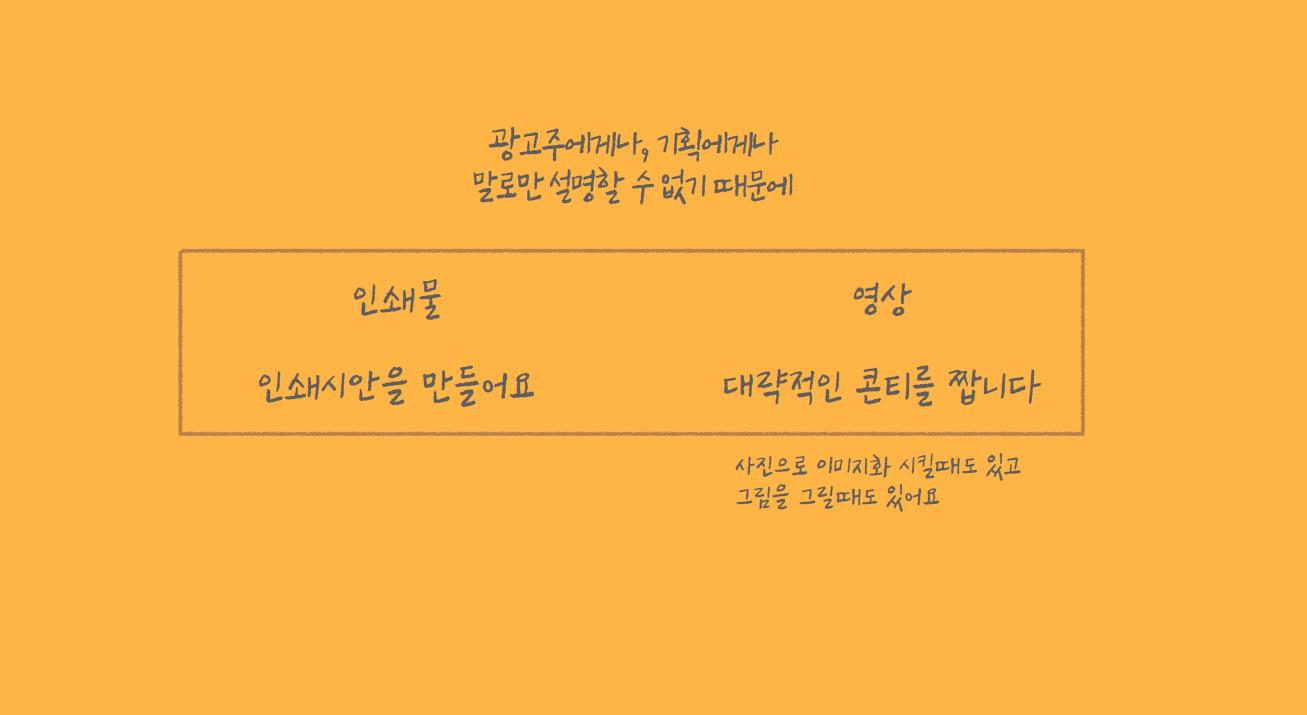 일단 광고의 콘셉트가 정해지면 비주얼 크리에이티브 작업에 들어가는데요, 인쇄물은 인쇄 시안을 만들고 영상은 대략적인 콘티를 짭니다. 아트디렉터에게 ‘소통’은 굉장히 중요한데요, 광고기획자, 카피라이터 등 많은 사람들과 협업을 하다 보니 원하는 방향을 명확하게 설명할 수 있는 능력이 필요합니다. 틀린 건 없는지, 견적은 맞는지 뭐 수정은 잘 됐는지 스케줄은 어떻게 됐는지, 소통할 경우가 굉장히 많아요.