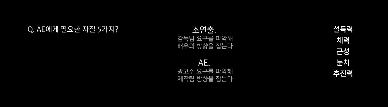 이 경험이 광고기획자(AE)와 어떻게 닿아있는지를 말했습니다. 예를 들어 조연출은 감독님의 피드백을 받아서 배우들을 설득하고, 배우들에게 방향을 제시하는 일이었습니다. 광고기획자(AE)는 광고주의 과제에 따라 전략과 기획을 짜고, 크리에이티브로 구현하는 제작팀과 커뮤니케이션을 통해 방향을 잡아주는 일을 합니다. 그렇기 때문에 광고 경험이 없어도 감독님과 배우들 사이에서 커뮤니케이션했던 역할을 잘했기에 광고기획자(AE)로써도 충분히 잘 해낼 수 있다고 생각했습니다.