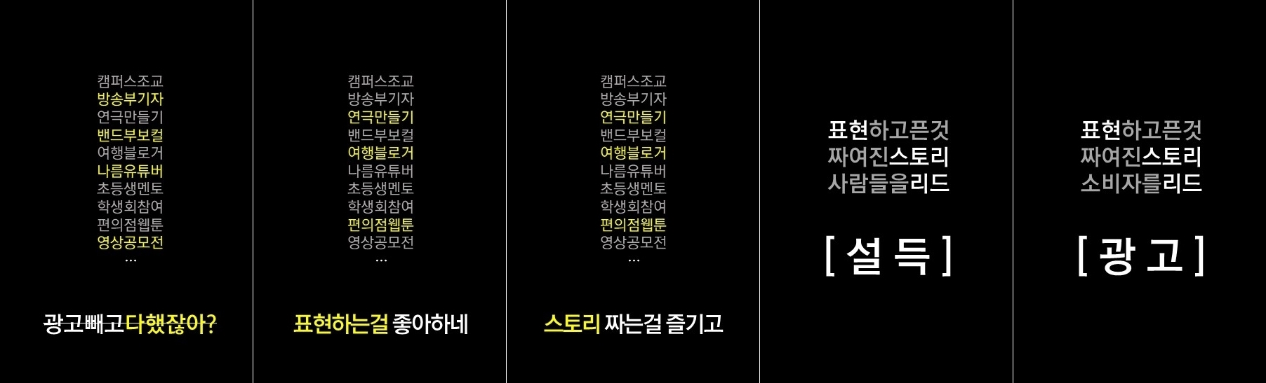 이런 고민을 하다, 한 가지 키워드를 발견했습니다. 그게 바로 '설득'이었어요. 앞선 활동들을 통해 남을 설득하는 일을 많이 해왔고, 설득하는 일을 잘할 수 있겠다는 자신이 생겼습니다. 이 '설득'이라는 키워드가 좀 마음에 들었던 이유는 이야기들을 조금만 바꿔보면 이게 광고를 정의하는 말처럼 느껴졌습니다. 광고도 역시 소비자한테 내가 표현하고 싶은 점을 찾아서 스토리를 구성해 물건을 사세요!라고 말하는 일이기 때문에 광고와도 굉장히 맞닿아 있는 일이라고 생각했습니다.
