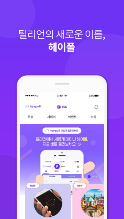 헤이폴(heypoll.co.kr) 서비스는 서베이 플랫폼 분야에서 선도적인 역할을 해 온 자사의 틸리언(Tillion) 서비스가 보유한 국내 최대 규모의 패널 기반으로, 실시간으로 참여·공유하는 ‘의견 공감’ 서비스라는 아이덴티티를 결합해 선보인 서비스입니다. 플랫폼 자체를 소통이 재미있는 놀이터, 즐거움이 있는 공간으로 확장해 4월 말 새롭게 런칭했습니다.