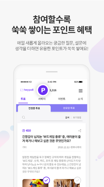셀프 서베이 플랫폼이라는 분야에서 선도적인 역할을 해 온 틸리언의 패널은 국내 최대 규모 수준입니다. 헤이폴에서는 투표와 서베이, 이벤트 등을 통해 헤이폴 포인트를 쌓는 방식은 기존과 동일하되 여기에 참여하는 즐거움, 공유하는 즐거움을 배가하기 위해 투표는 최소 1포인트에서부터 100포인트 이상 얻을 수 있는 투표로 구분되어 진행하게 됩니다. 참여하는 투표마다 얻을 수 있는 포인트가 다양해졌고요, 또 상대적으로 많은 포인트를 얻을 수 있는 서베이는 최대 3천 포인트 이상도 얻을 수 있기에 매일 매일 투표와 서베이에 참여할수록 많은 포인트를 모을 수 있습니다. 적립한 헤이폴 포인트를 통해 OK캐쉬백 포인트로 전환을 하거나 혹은 모바일 상품권 구매가 가능하기에 쏠쏠하게 활용할 수 있는 강점도 가지고 있습니다.