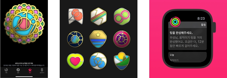 그리고 개인 최고 기록을 경신하거나 성과를 이룰 때마다 배지가 수여되고, 획득한 배지들은 iPhone의 ‘활동’ 앱에 디지털 배지 진열장에 차곡차곡 쌓인다. 또한 친구 혹은 가족과 활동링 ‘공유’가 가능하다. 서로 메시지를 통해 응원을 하거나 선의의 경쟁심을 불러 일으킬 수도 있다.