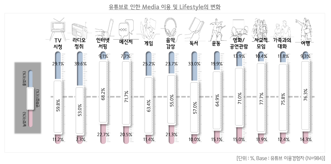 TV, 라디오 등 전통 매체의 이용은 감소한 반면, 유튜브 콘텐츠 관련 정보 탐색 및 공유/확산을 위한 온라인/SNS 활동은 증가한 것으로 나타났습니다. 또한 여유 시간을 즐기는 수단인 게임과 음악 감상 활동은 다소 감소하였고(10대는 음악 감상 활동 증가), 또 하나의 정보/지식 습득 채널인 독서의 가치는 크게 감소하는 추세입니다. 새로운 여행지 추천 등으로 인한 여행은 다소 증가한 반면 외부 활동(영화/공연관람 및 모임 등)과 가족과의 관계에 유튜브가 미치는 영향은 미미한 것으로 나타났습니다.