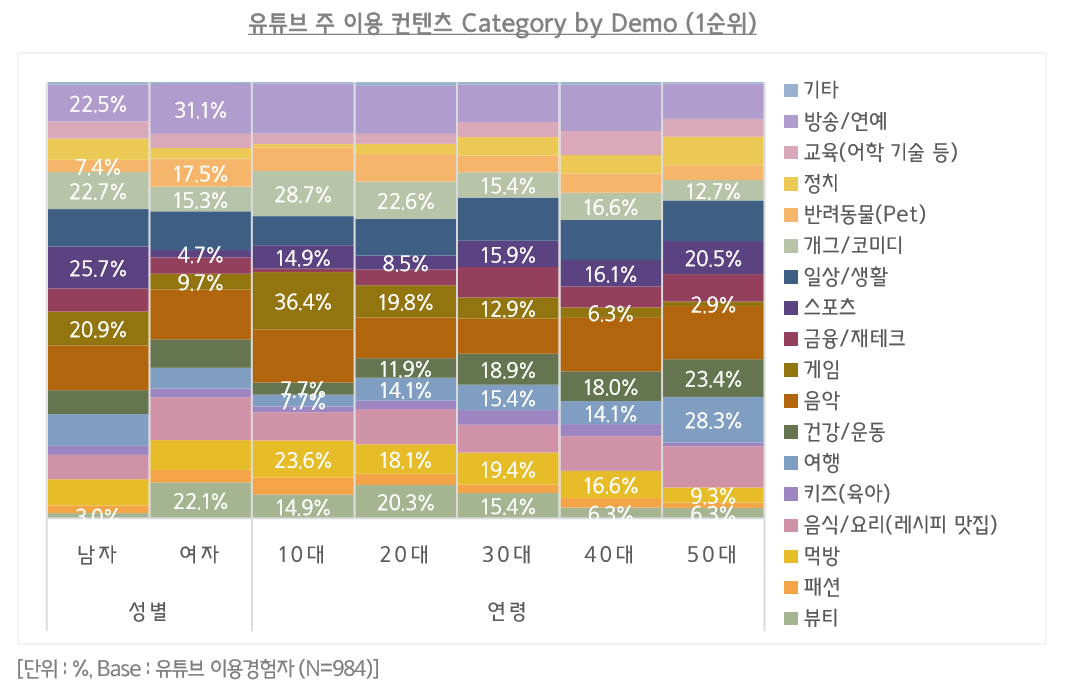 나이, 성별뿐만 아니라 개개인들의 상황과 관심사에 따라 주로 이용하는 콘텐츠는 차이가 있겠지만, 2019년 현재 대한민국 1459세 유튜브 이용자들에게 가장 사랑받는 주제는 음악(29.3%) >방송/연예(26.7%)>일상/생활(23.5%)>음식/요리(20.6%)순으로 나타났습니다.(1+2+3순위기준).