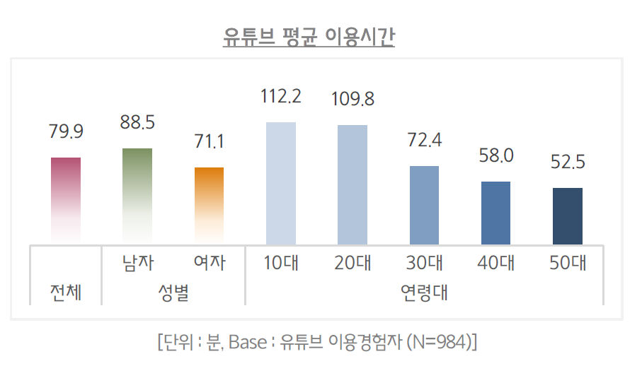 유튜브 이용 경험자 전체의 하루 평균 유튜브 이용 시간은 78.9분으로 나타났습니다. 여자(77.1분)보다는 남자(88.5분)가 더 유튜브를 많이 이용하고 있습니다.  유튜브 평균 이용 시간 결과에서도 연령대에 따라 이용 수준의 차이는 뚜렷하게 드러납니다.