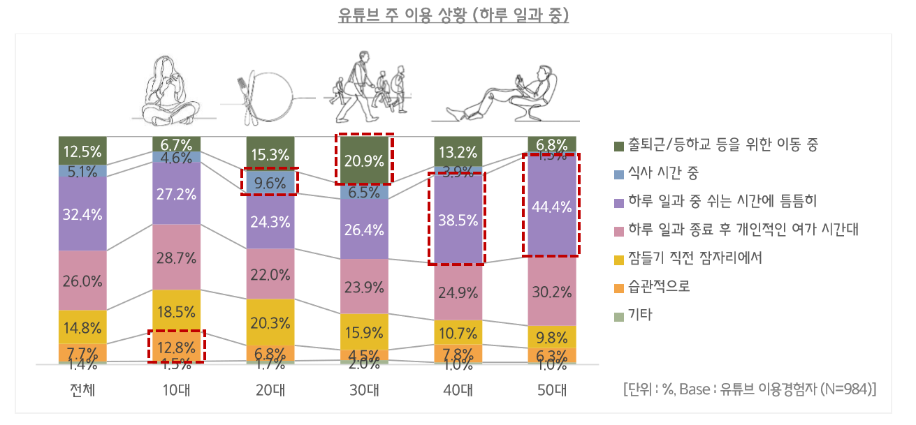 연령대별로도 유튜브를 주로 이용하는 상황에서 차이를 보이고 있습니다. 10대에게는 이미 습관이 되어버린 유튜브(아빠 엄마 몰래몰래~), 20대에게 유튜브는 혼자만의 시간이 외롭지 않도록 세상과 연결해 주는 창문으로, 30대 직장인들에게는 길고 힘든 출퇴근길을 함께 해주는 친구로, 그리고 40-50대에게는 무료한 시간을 달래주는 유쾌한 친구로, 그렇게 오늘도 대한민국의 유튜브는 열일을 하고 있습니다.