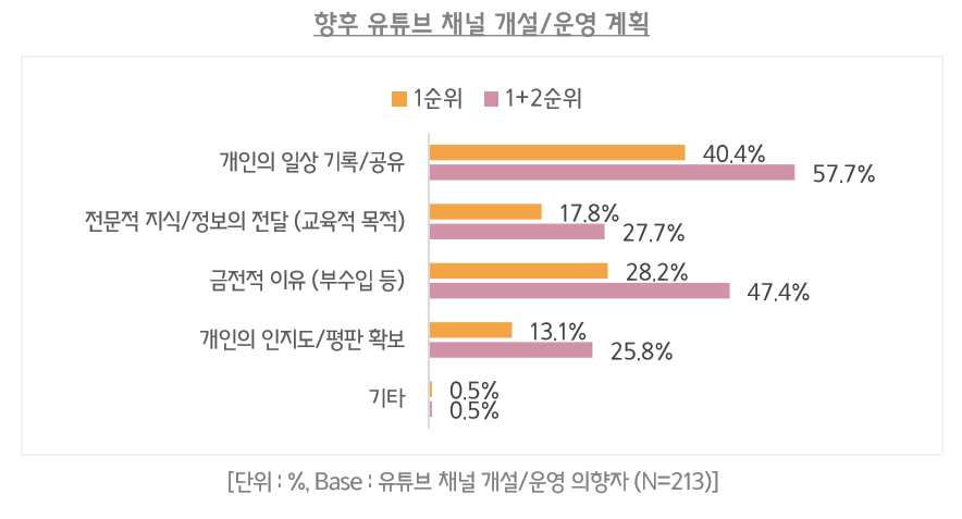 직접 유튜브 채널을 개설/운영하려는 목적으로 ‘개인의 일상 기록/공유’ 목적을 1순위로 꼽은 사람이 가장 많았으나, 보다 주목할 부분은 ‘금전적 이유’를 중요하게 생각하는 사람이 절반에 가깝다는 점일 것 같습니다. 최근 유명 유튜버들의 어마어마한 수입이 드러나면서 많은 사람들의 관심을 끌고 있는데요, 본 질문의 결과에 담겨있는 의미는 사실, 유튜브의 목적이 개인의 일상을 기록/공유한다는 명목 뒤에 숨어있는, 결국은 추가적인 수입에 대한 막연한 기대 심리는 아닐까 생각됩니다.
