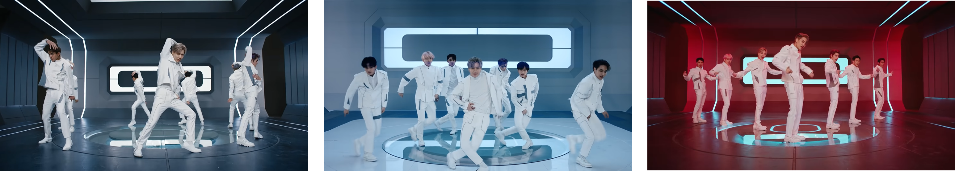 K-POP 어벤저스 그룹답게 촬영 현장에서도 SuperM 멤버들의 프로페셔녈한 모습을 볼 수 있었는데요, 총 4일이 소요된 촬영 기간 중 이틀에 걸쳐 군무 촬영이 진행되었습니다. 새벽까지 이어지는 군무 촬영에서 멤버들은 수십 번에 걸친 안무를 힘든 내색 한 번 보이지 않고 소화해냈고, 마지막 군무에서는 현장 스텝들의 큰 박수를 받기도 했습니다.