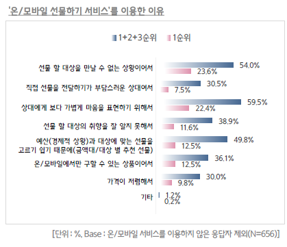 온/모바일 선물하기 서비스를 이용한 이유로 가장 많은 사람들이 ‘상대방에게 보다 가볍게 마음을 표현하기 위해서‘를 꼽았습니다. 기존 선물 문화에 적지 않은 부담감을 가지고 있던 소비자들이 모바일 쿠폰의 대중적인 사용과 함께 그 부담감을 조금은 떨쳐 냈을 것이라는 해석을 가능케 합니다.