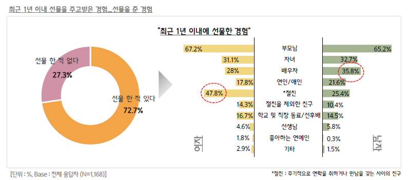 최근 1년 이내에, 대한민국 1459세 남녀는 얼마나 선물을 주고받았을까요? 또한 어떤 선물을 주고받았는지 알아보았습니다.