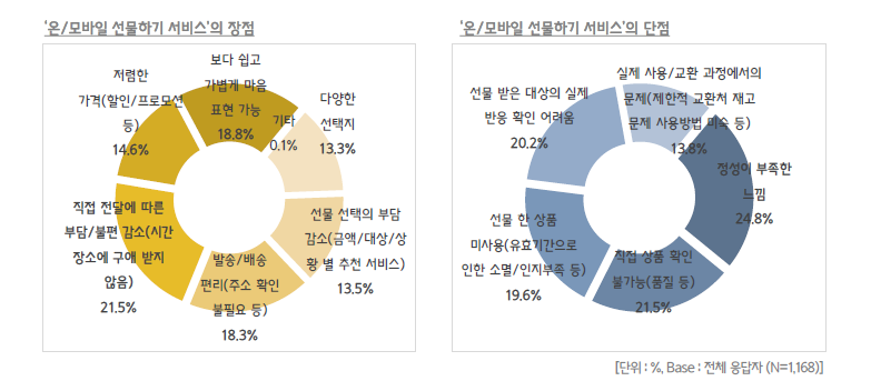 이용자들은 직접 전달에 따른 부담/불편 감소를 온/모바일 서비스의 가장 큰 장점으로 답변했습니다. 반면에 정성이 부족하다 등을 단점으로 꼽고 있습니다. 온/모바일 선물하기 서비스를 이용해 보다 일상적으로 선물을 주고받는 것이 가능해진 가운데, 이런 방식이 기존 선물 문화보다 덜 부담스럽다고 말하는 응답자의 생각을 확인할 수 있었습니다. 이렇듯 온/모바일 선물하기 서비스는 ‘선물 문화’에 적지 않은 변화를 주고 있는 것으로 보입니다.