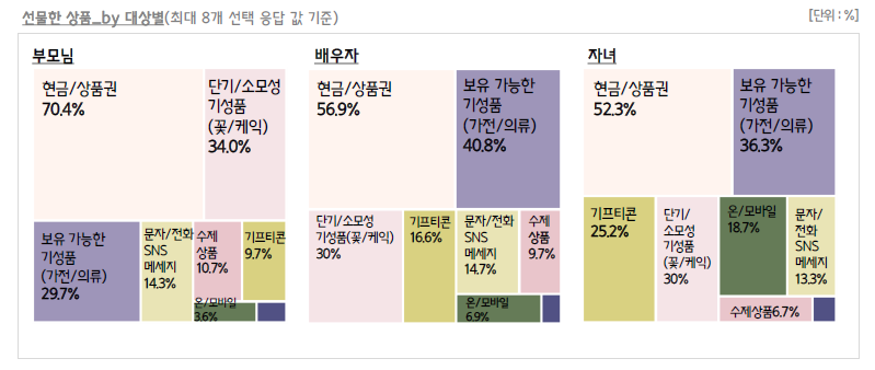이와 반대로 자녀에게 준 선물에는 기프티콘이 다른 대상보다 상대적으로 높게 나타났습니다(25.2%). 이는 부모님이 기프티콘의 사용법을 잘 알고, 편리하기 쉽게 생각하는 자녀들의 연령대를 고려한 선물을 하였다고 해석할 수 있습니다.