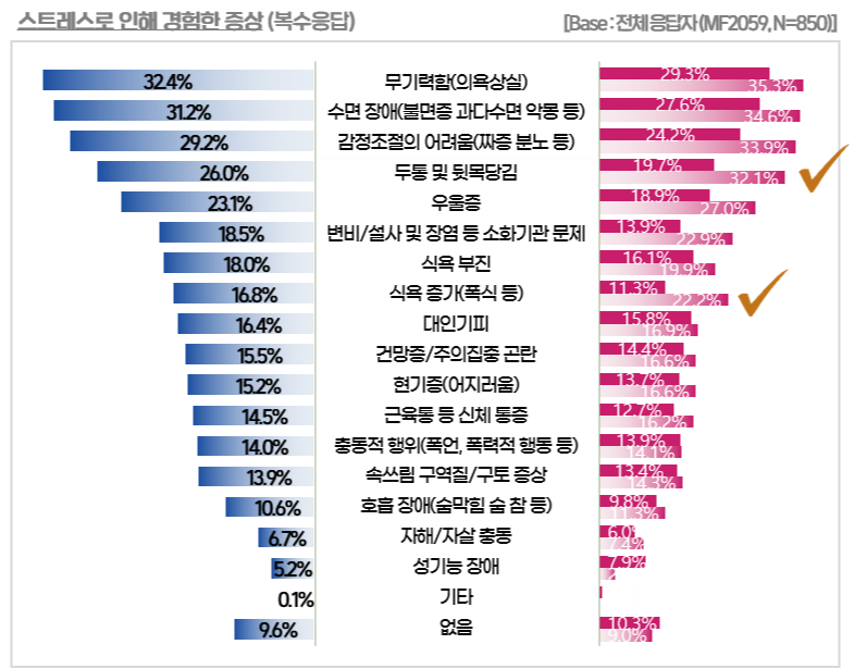 스트레스로 인해 경험한 증상을 묻는 질문에, 2059세 남녀 전체 응답자의 32.4%는 ‘무기력함(의욕상실)’을 겪었다고 응답했습니다. 또한 불면증, 과다수면 등의 ‘수면 장애‘를 겪은 사람도 31.2%이 이르렀고, 그 뒤를 ‘감정조절의 어려움(29.2%)’, ‘두통 및 뒷목당김(26.0%)’, ‘우울증(23.1%)’ 등이 이었습니다. ‘자해/자살 충동’과 같이 극단적인 증상을 경험한 사람도 6.7%에 이르렀습니다.