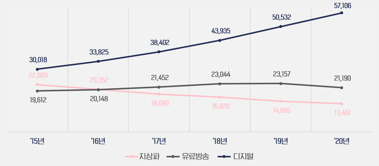 지상파 중간광고 시행은 종합편성채널의 출범과 뉴미디어의 활성화로 줄어드는 지상파 매출과 경영악화를 해결하기 위한 특효약으로 처방 되었습니다. 매년 성장해온 디지털 광고비 대비 지상파 광고비는 지속적으로 하락했고 2017년부터는 유료방송에도 추월당하고 말았습니다.
