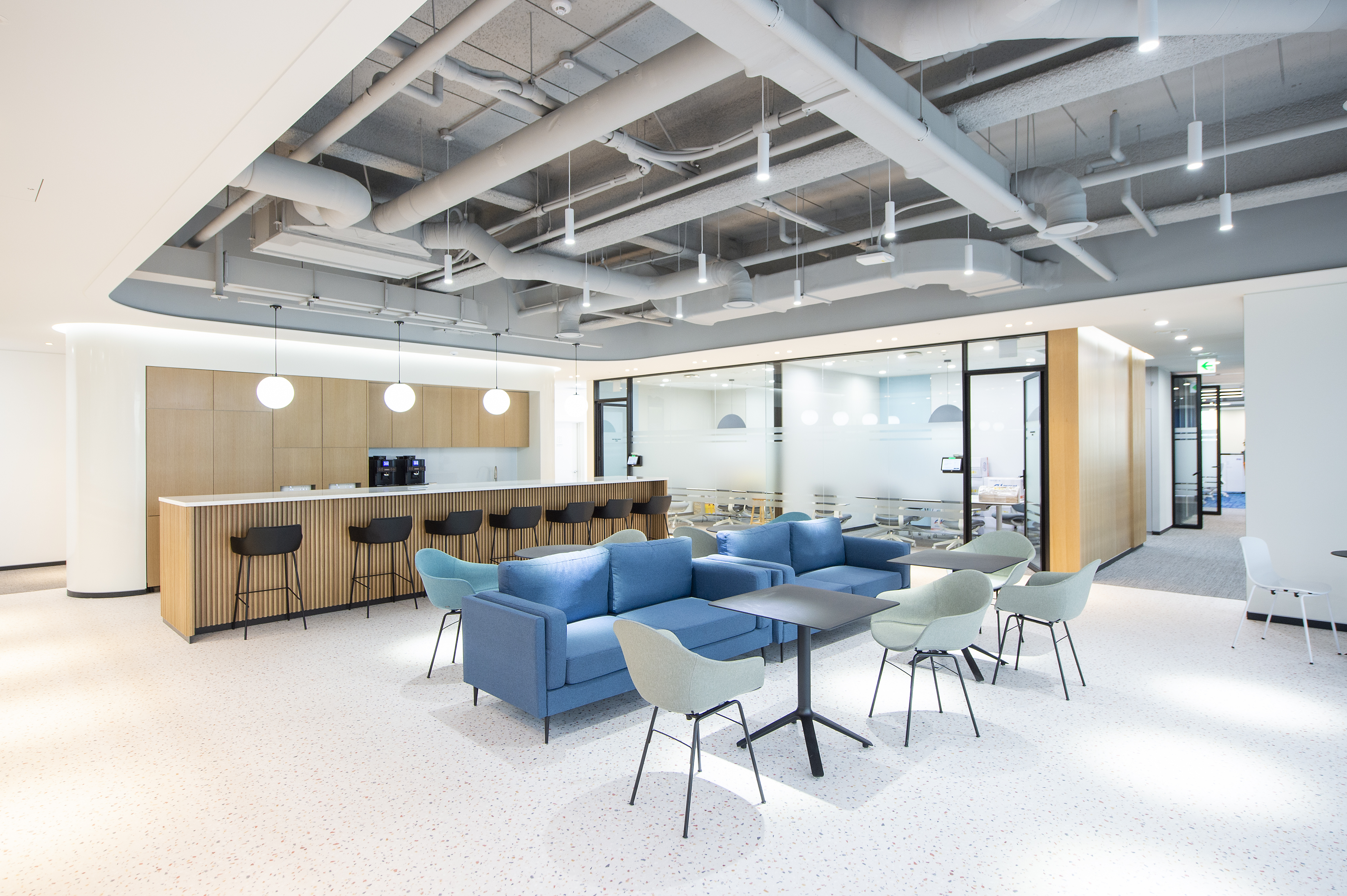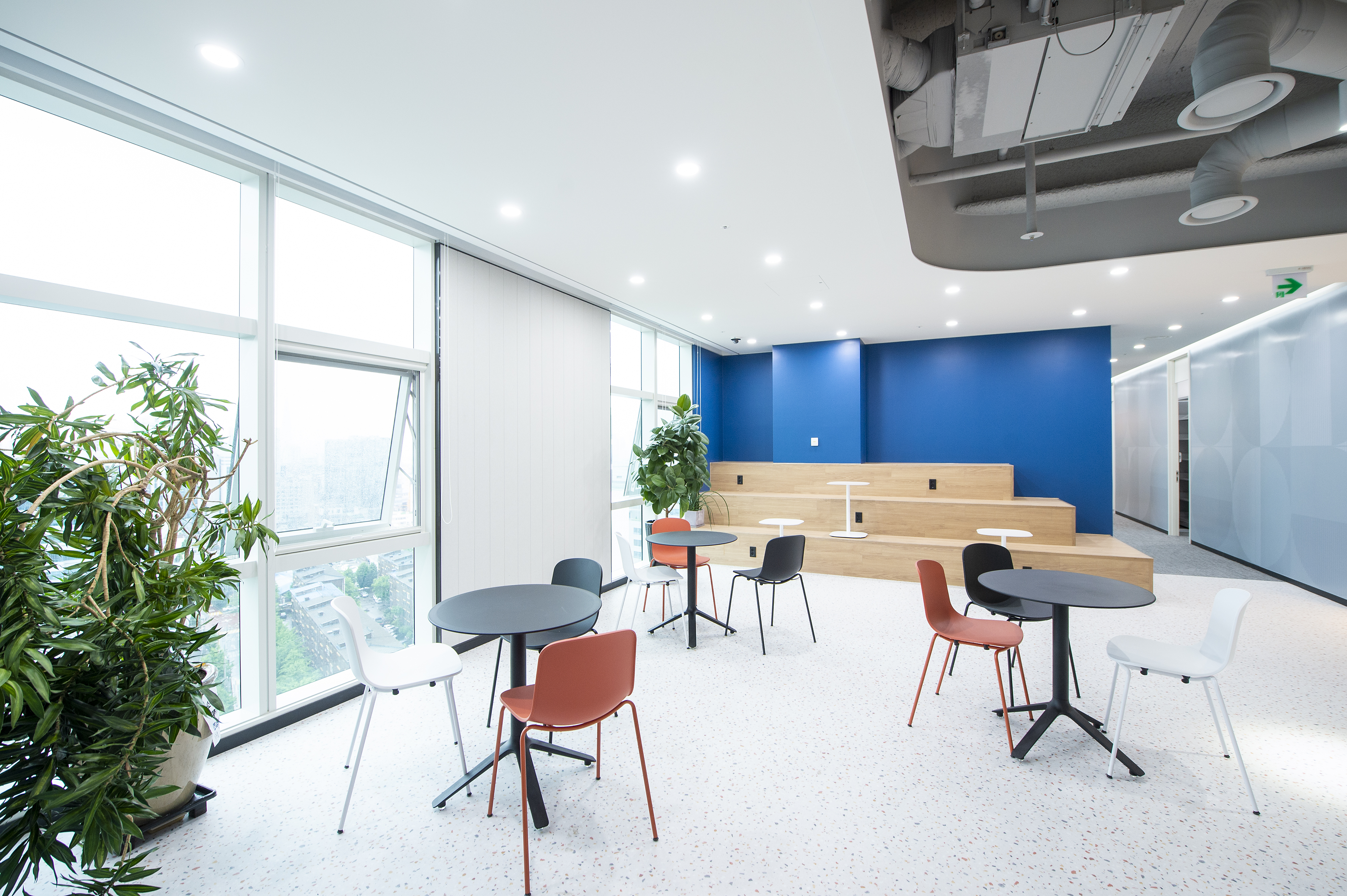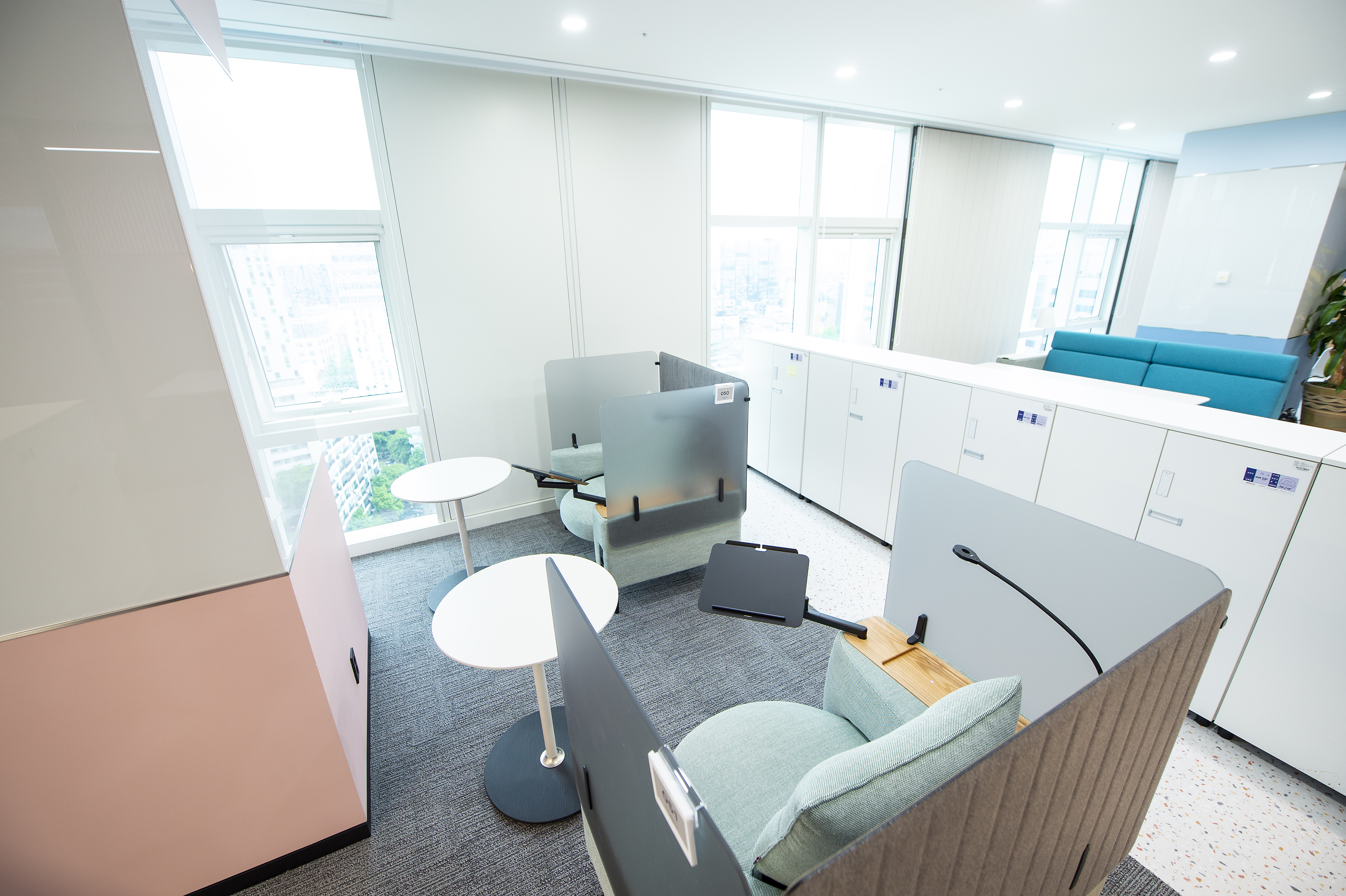 대표적인 공간으로는 이전 사옥에서는 존재하지 않았던 워크 라운지Work Lounge, 포커스룸Focus Room, 폰룸Phone Room 등을 꼽을 수 있습니다. 무엇보다 워크라운지의 경우, 스마트오피스의 핵심인 '공간을 공유한 설계'가 잘 들어맞는 곳이라고 설명할 수 있겠는데요. 가용 공간을 활용해 개방감을 극대화하고 넓고 쾌적하게 설계된 '라운지'를 각 층에 배치해 다양한 형태의 테이블과 의자를 두었습니다. 일하다가 커피 한잔 마시며 쉴 수도 있고, 점심시간에는 팀원들과 가벼운 스낵 등으로 점심을 먹을 수 있습니다. 카페에서 공부나 일을 하면 능률이 오르는 '카공족' 스타일의 구성원들은 백색소음을 들으며 업무를 볼 수도 있도록 구현한 것이죠.