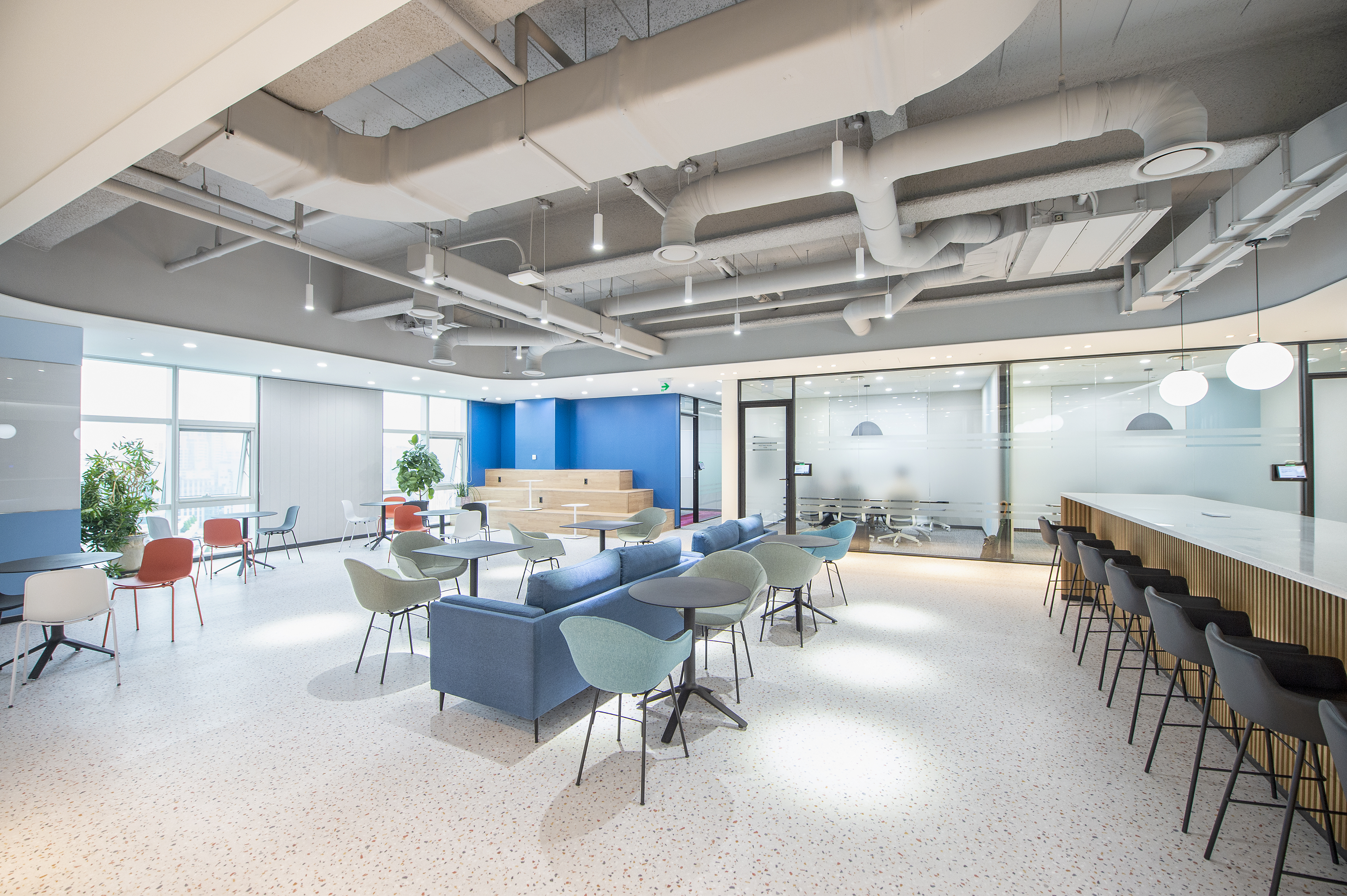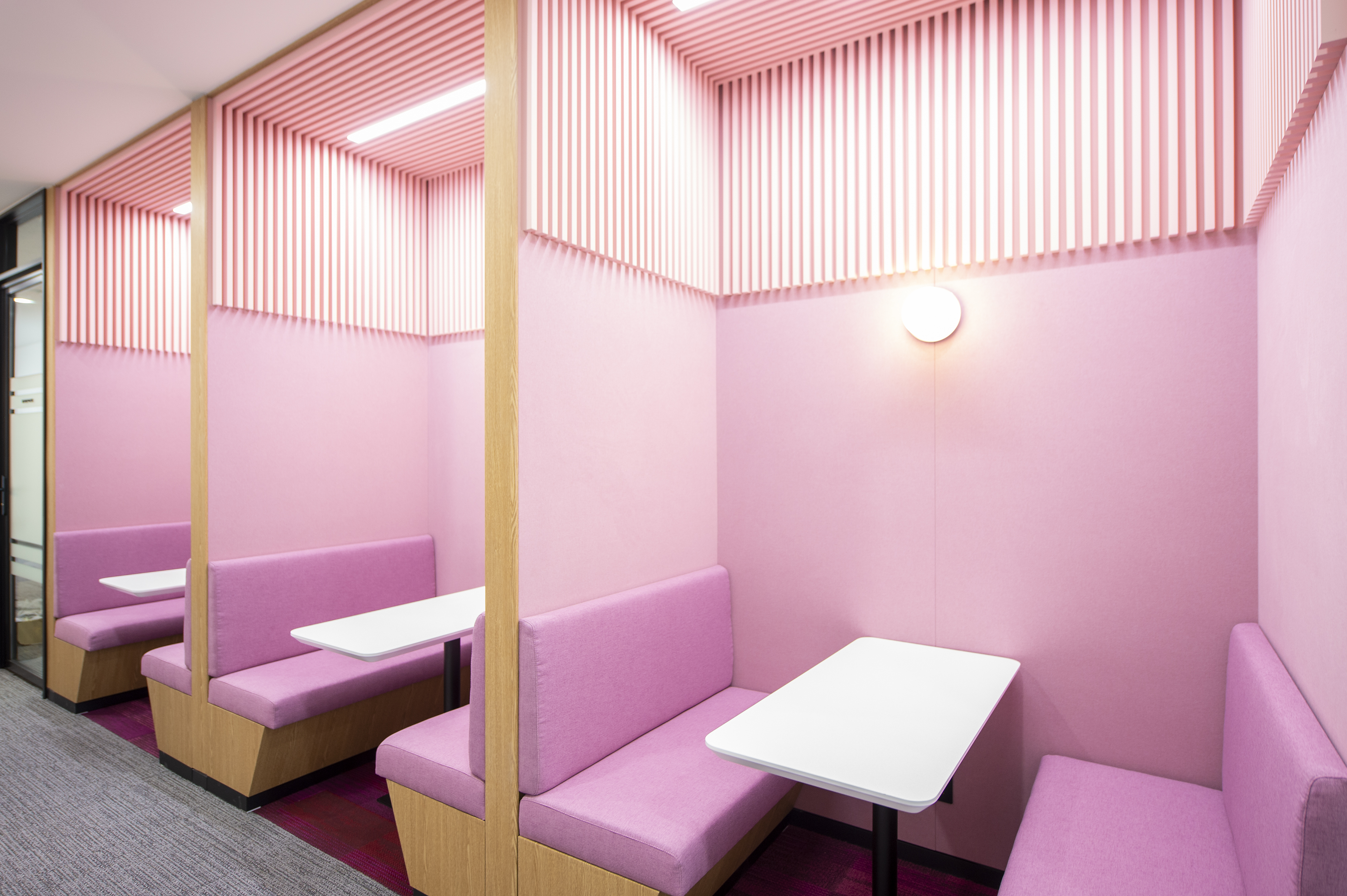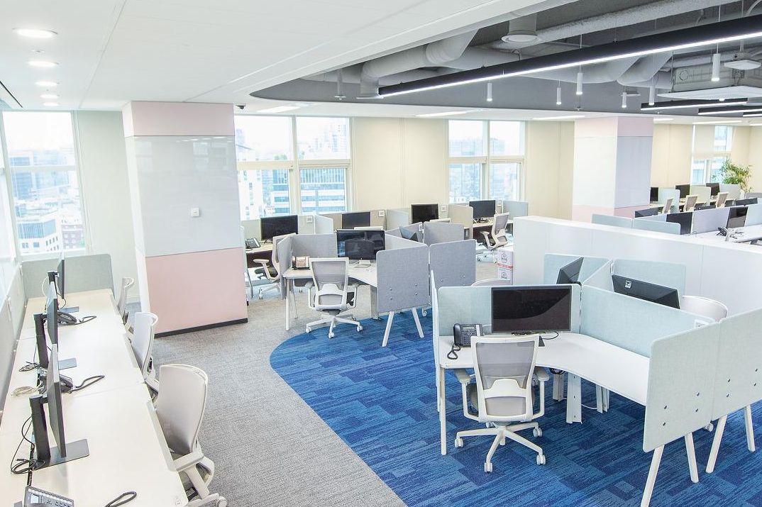 대표적인 공간으로는 이전 사옥에서는 존재하지 않았던 워크 라운지Work Lounge, 포커스룸Focus Room, 폰룸Phone Room 등을 꼽을 수 있습니다. 무엇보다 워크라운지의 경우, 스마트오피스의 핵심인 '공간을 공유한 설계'가 잘 들어맞는 곳이라고 설명할 수 있겠는데요. 가용 공간을 활용해 개방감을 극대화하고 넓고 쾌적하게 설계된 '라운지'를 각 층에 배치해 다양한 형태의 테이블과 의자를 두었습니다. 일하다가 커피 한잔 마시며 쉴 수도 있고, 점심시간에는 팀원들과 가벼운 스낵 등으로 점심을 먹을 수 있습니다. 카페에서 공부나 일을 하면 능률이 오르는 '카공족' 스타일의 구성원들은 백색소음을 들으며 업무를 볼 수도 있도록 구현한 것이죠.