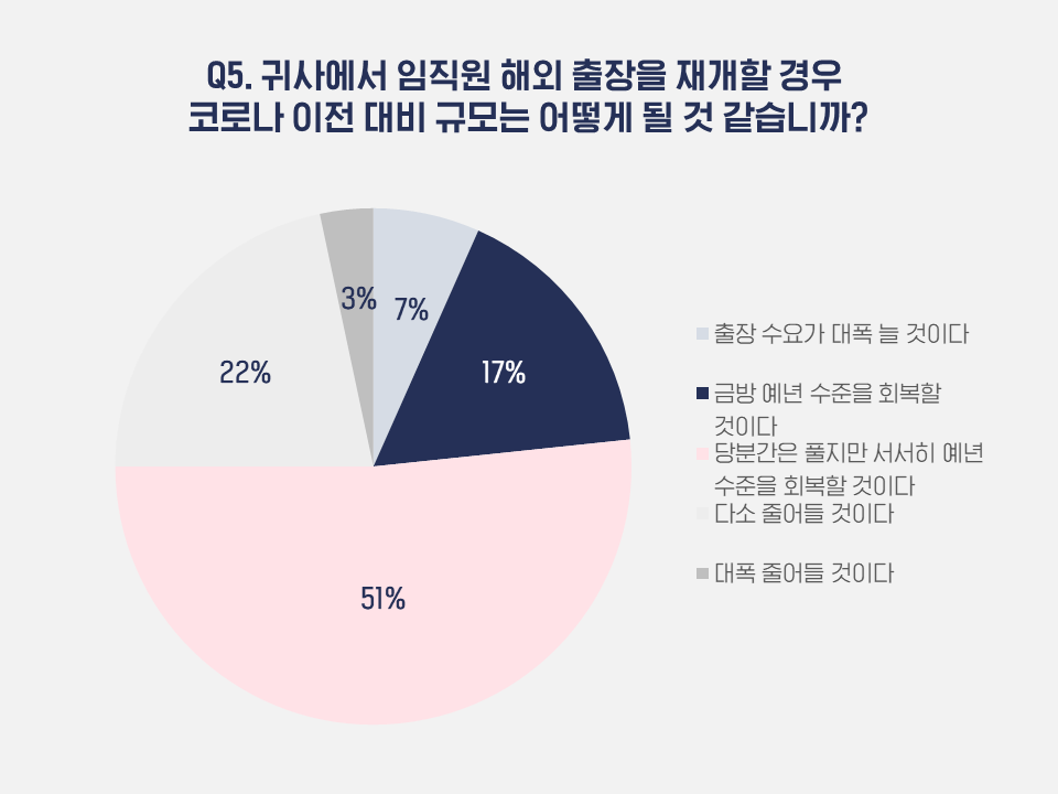 Q5. ‘임직원 해외 출장을 재개할 경우 코로나 이전 대비 규모는 어떻게 될 것 같습니까’라는 질문에 응답자의 50.8%'당분간은 줄지만 서서히 예년 수준을 회복할 것'이라고 답했고, 16.4%가 '금방 예년 수준을 회복할 것'이라고 답했습니다