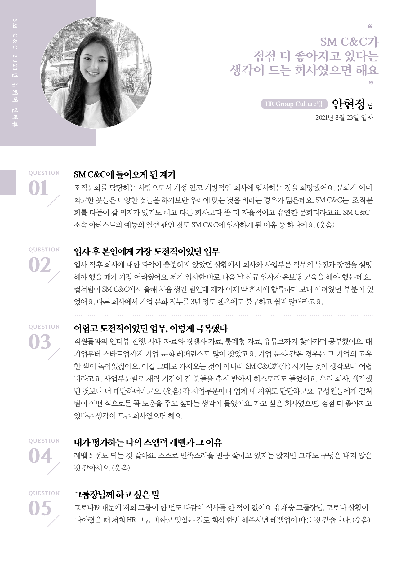 SM C&C LETTER는 2022년에도 SM C&C 사람들과 각 사업부문의 이야기를 담아 찾아갑니다.