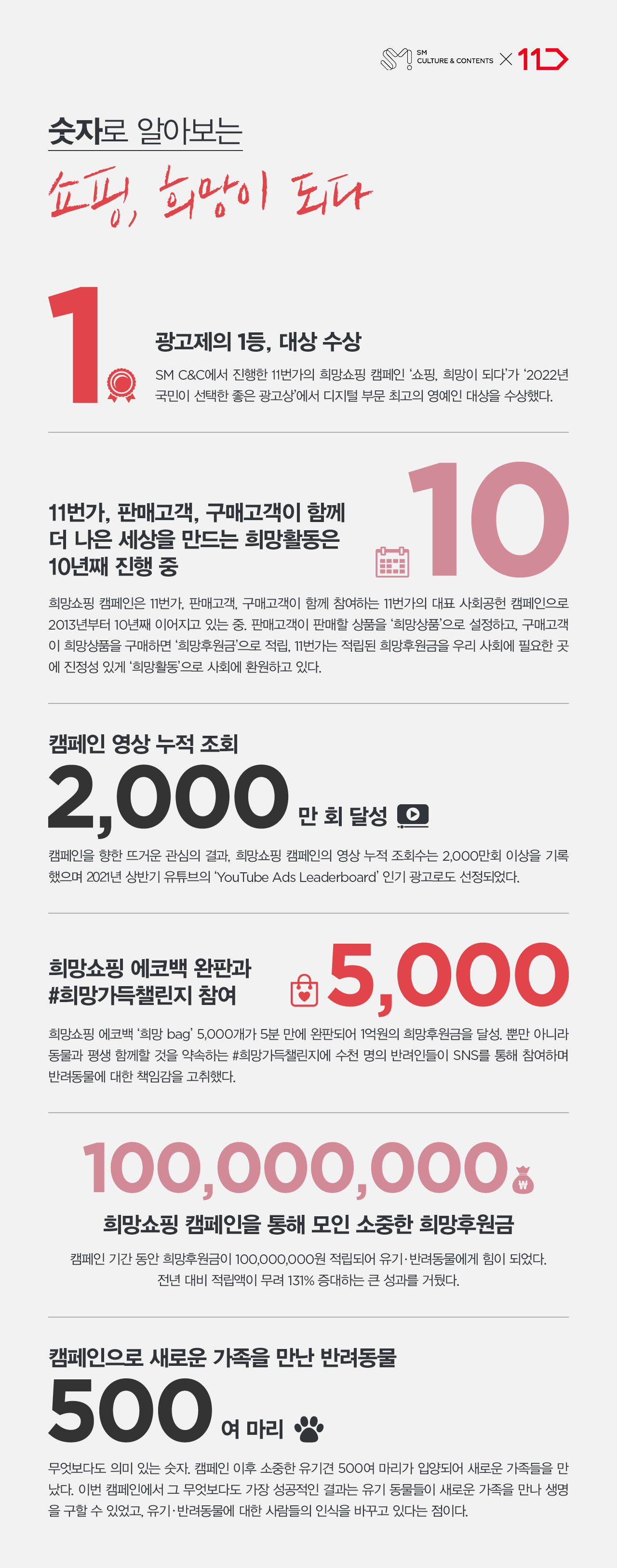 ‘쇼핑, 희망이 되다’ 캠페인은 2013년부터 10년째 이어온 11번가의 대표적인 사회 공헌 활동으로 희망쇼핑 상품 판매 수익금의 일부를 희망후원금으로 기부하는 프로그램입니다. 올해는 유기·반려동물의 올바른 입양 및 반려 문화를 위한 캠페인을 진행했는데요. 누구나 선한 영향력을 펼칠 수 있다는 메시지를 일상적인 이야기로 이해하기 쉽게 풀어내 국민적인 공감대를 형성했다는 평을 들으며 대상으로 선정됐습니다.