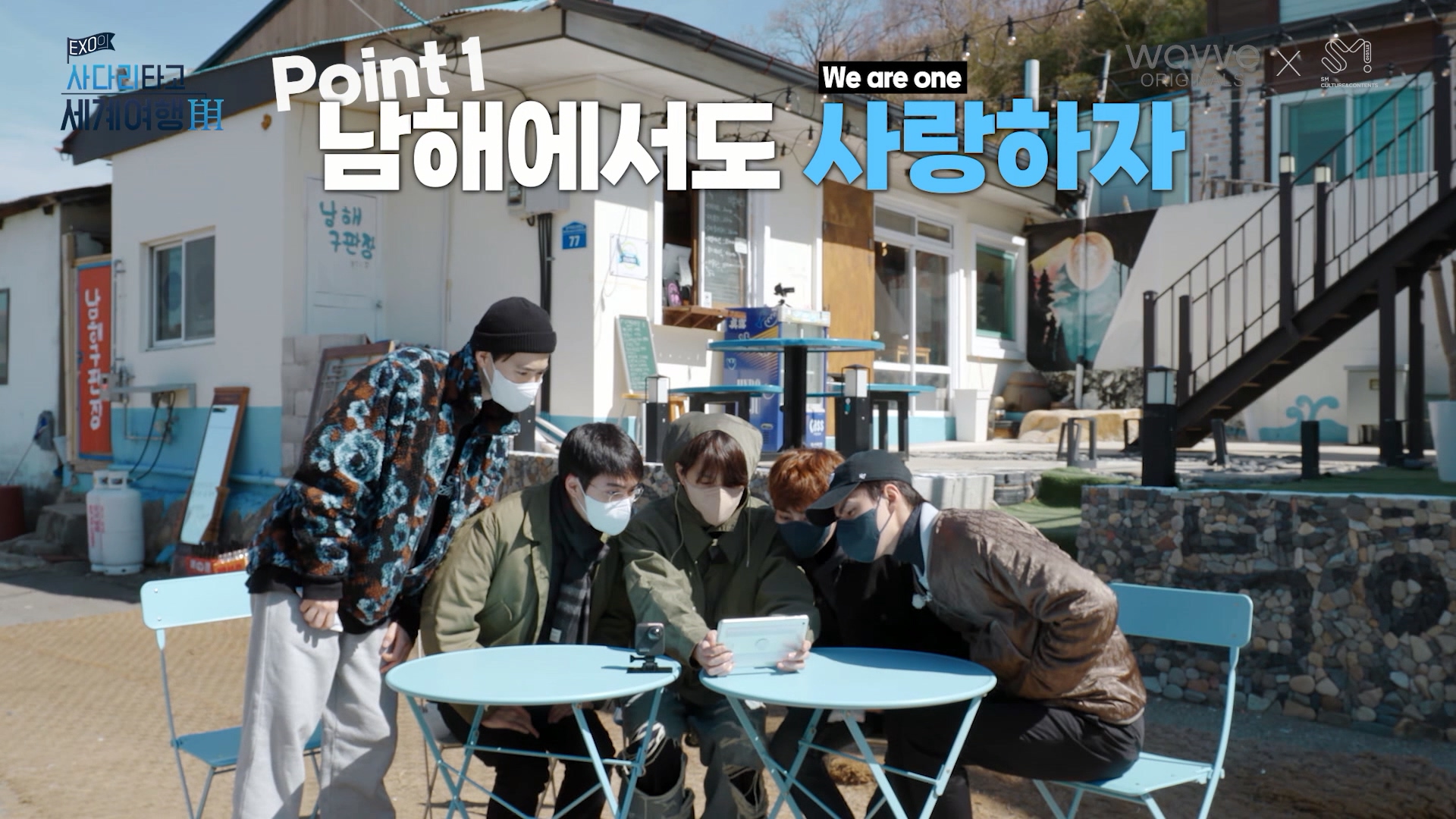왕년에 ‘으르렁’ 좀 들었던 사람이라면 이 구호 역시 낯설지 않을 겁니다. “WE ARE ONE!” 말 그대로 군백기 동안 개인 활동 위주로 스케줄을 소화하던 멤버들이 ‘EXO’라는 이름 아래 하나(ONE)로 뭉쳤습니다. 다섯 명이 한 마음으로 떠난 첫 남해 여행기를 이번 <엑사세 3>를 통해 만나실 수 있습니다.