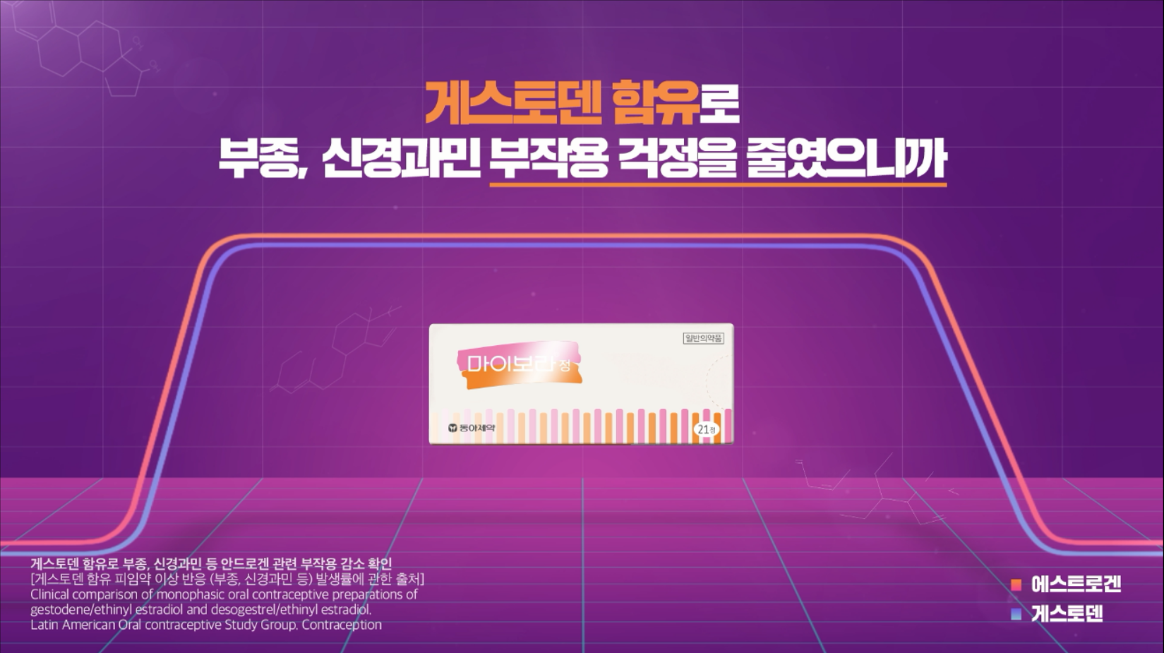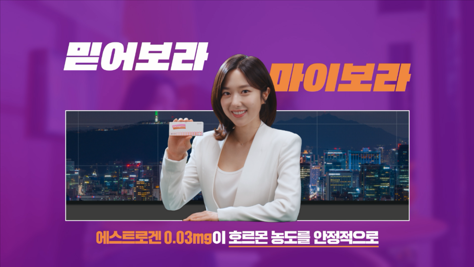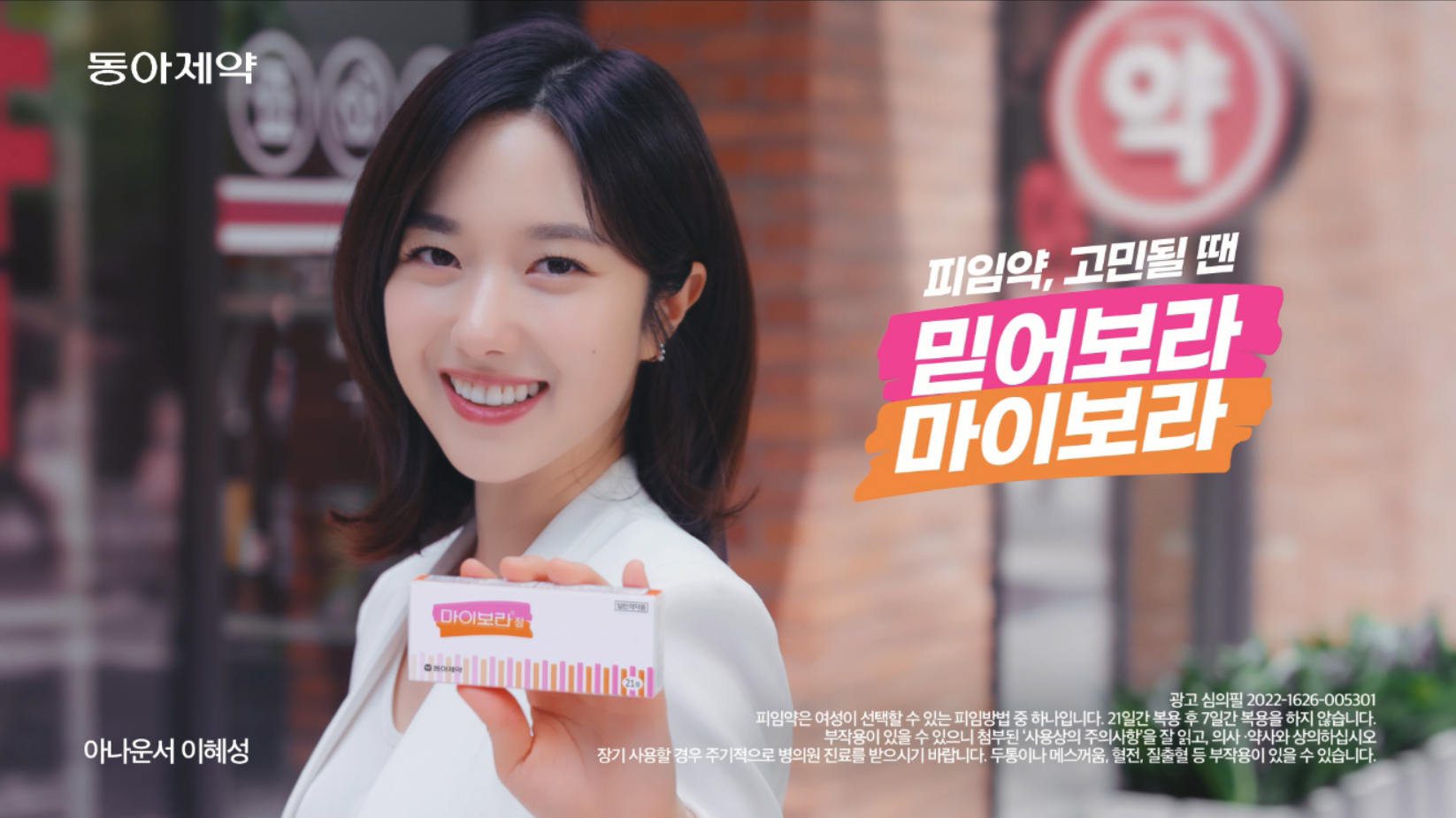 제품의 효능과 안전성을 이해하기 쉽게 전달하기 위해 타깃과 동일한 성별·세대로 공감대를 형성하고 동시에 전문성과 신뢰감이 높은 아나운서 출신 방송인 이혜성을 모델로 발탁했다. 마이보라가 필요한 여성들의 상황을 이혜성이 뉴스 앵커로 보도하는 스토리로 피임약 복용 시 가장 중요한 호르몬 농도 유지 및 부종, 신경과민 등의 부작용 감소와 같이 제품의 특장점을 녹여냈다.